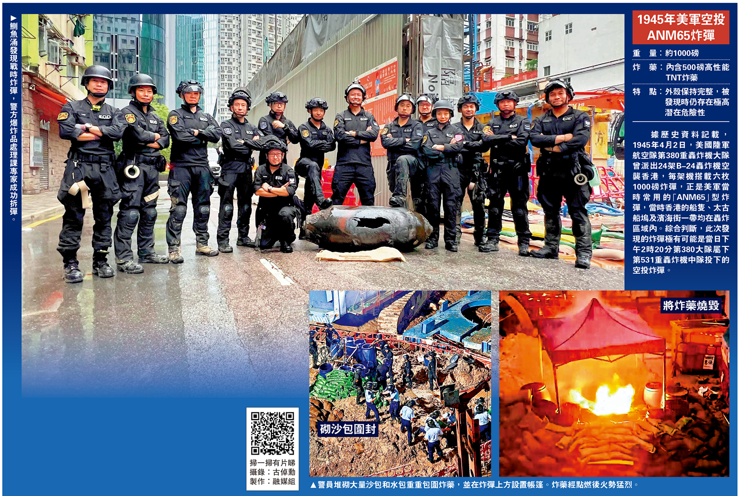 鰂魚涌濱海街16至22號地盤前日(19日)發現一枚長約1.5米,重約1000磅的美軍空投「ANM65」戰時炸彈,附近18棟大廈約6000名居民需緊急疏散,警方聯同消防處、民政處、民安隊及關愛隊通宵協助所有受影響居民有秩序疏散及提供協助。警方爆炸品處理課人員昨日凌晨2時起通宵拆彈,約9個小時迅速完成,並安排受影響的居民返回住所及重開封閉道路。