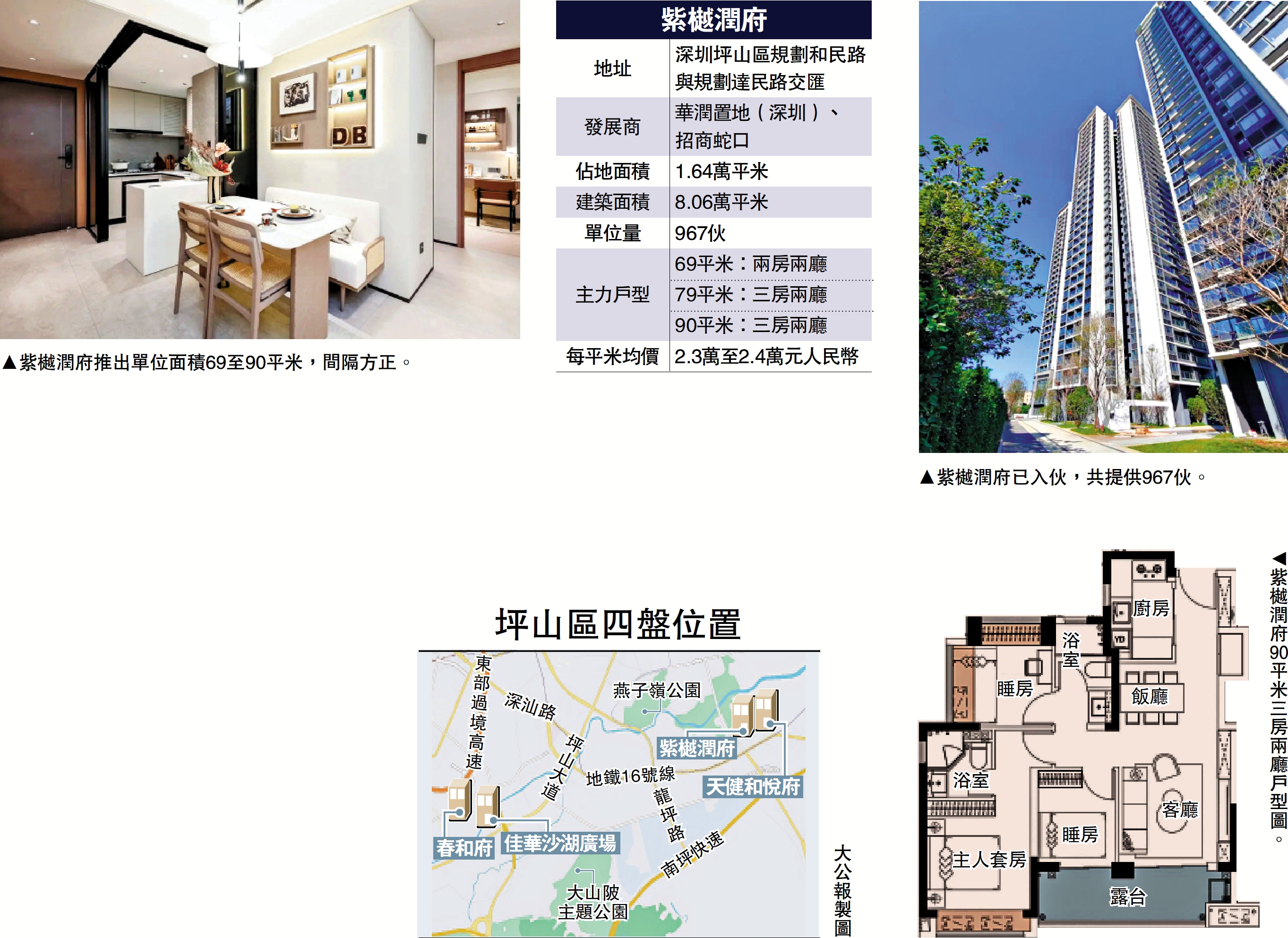 坪山區作為深圳房產價值窪地,吸引不少港人投資或自住。由華潤置地開發的紫樾潤府,90平米三房戶售價215萬元,性價比吸引。\大公報記者 李昌鴻深圳報道