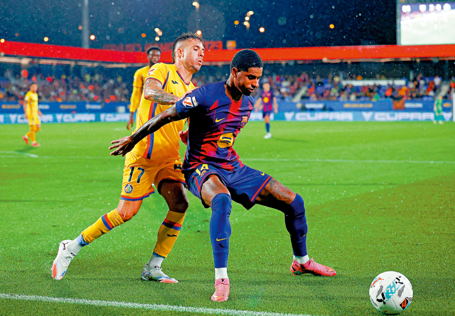 巴塞隆拿22日(周一)於西甲主場對基達菲,上周中在歐聯梅開二度的英格蘭前鋒拉舒福特(右),他在賽前會議遲到,因為紀律問題被主帥費力克貶為後備。不過拉舒福特仍在入替後爭氣交出助攻,協助巴塞以3:0大勝全取3分。賽後拉舒福特近3仗錄得2入球及2助攻,表現大勇。\路透社