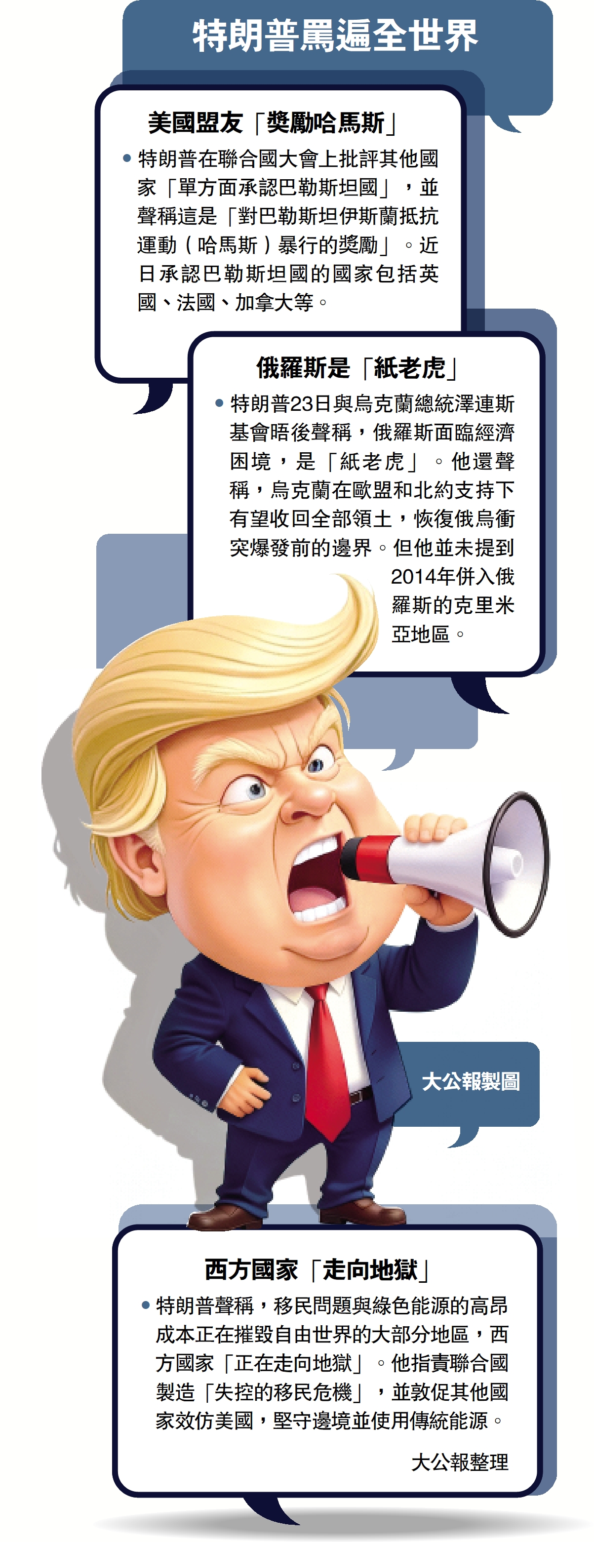 •特朗普在聯合國大會上批評其他國家「單方面承認巴勒斯坦國」,並聲稱這是「對巴勒斯坦伊斯蘭抵抗運動(哈馬斯)暴行的獎勵」。近日承認巴勒斯坦國的國家包括英國、法國、加拿大等。