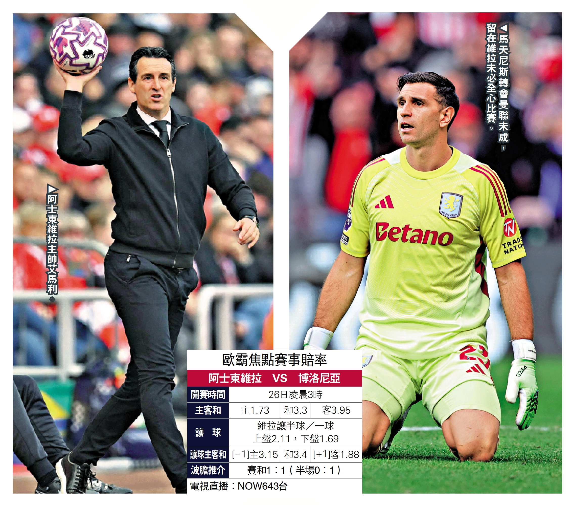 維拉將於明晨的首輪歐霸盃主場迎擊意甲博洛尼亞。雙方曾在上季歐聯首階段交手,同樣主場的維拉贏2:0,然而維拉目前正值頹勢,前線更加啞火,今戰有阿馬度奧拿拿和泰利文斯兩中場因傷缺陣,兩名借將哈維艾利洛和查頓辛祖就有機會首次正選列陣,在屈堅斯腳頭無靈之下,艾帥或以當耶爾馬倫取代。