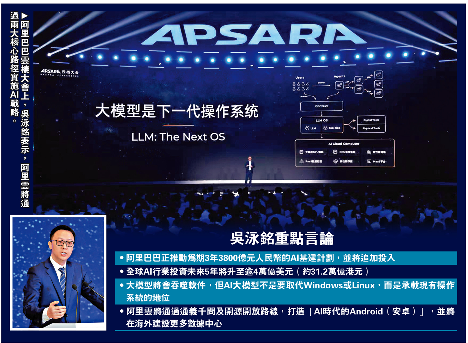 在阿里巴巴雲棲大會上,吳泳銘指出,目前Token消耗量每2至3個月便翻倍,近一年全球AI行業投資超過4000億美元(約3.12萬億港元),是人類歷史上最大的算力和研發投入,未來5年將進一步升至逾4萬億美元(約31.2萬億港元)。他表示,AI大模型成為作業系統,不是要取代Windows或Linux,而是在整個物理世界和數字世界的交互中,承載現有操作系統的地位,將真實世界的工具界面與大模型連接,所有用戶需求和行業應用將透過大模型相關工具執行任務,直言「大模型將會吞噬軟件」。