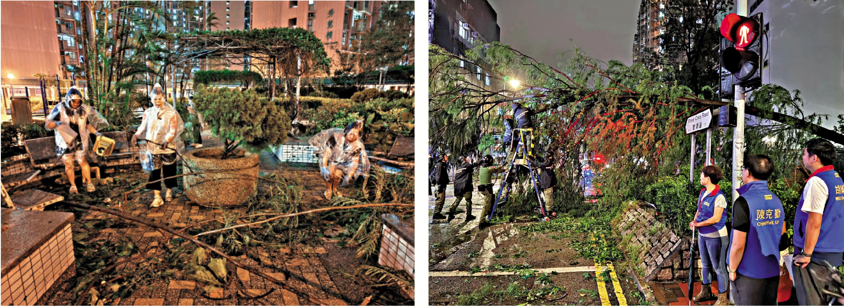 在將軍澳,十號風球期間多處出現大樹倒塌與海水倒灌,行人道一度受阻。至昨日下午約4時,將軍澳南海濱海水逐步退去,但沿岸行人路仍堆滿泥沙、樹枝及雜物,影響通行與環境衞生。隨着天文台於昨日夜晚改掛3號風球,西貢區議員陳志豪協同德明關愛隊立即展開災後清理行動,協助移走倒塌樹枝及路面雜物。他指出,關愛隊與義工將於第二日清晨抵達受海水倒灌的商場協助清理,他呼籲居民暫勿前往海濱、堆積點及尚未清理完成的路段,並密切留意政府公告與天氣資訊。