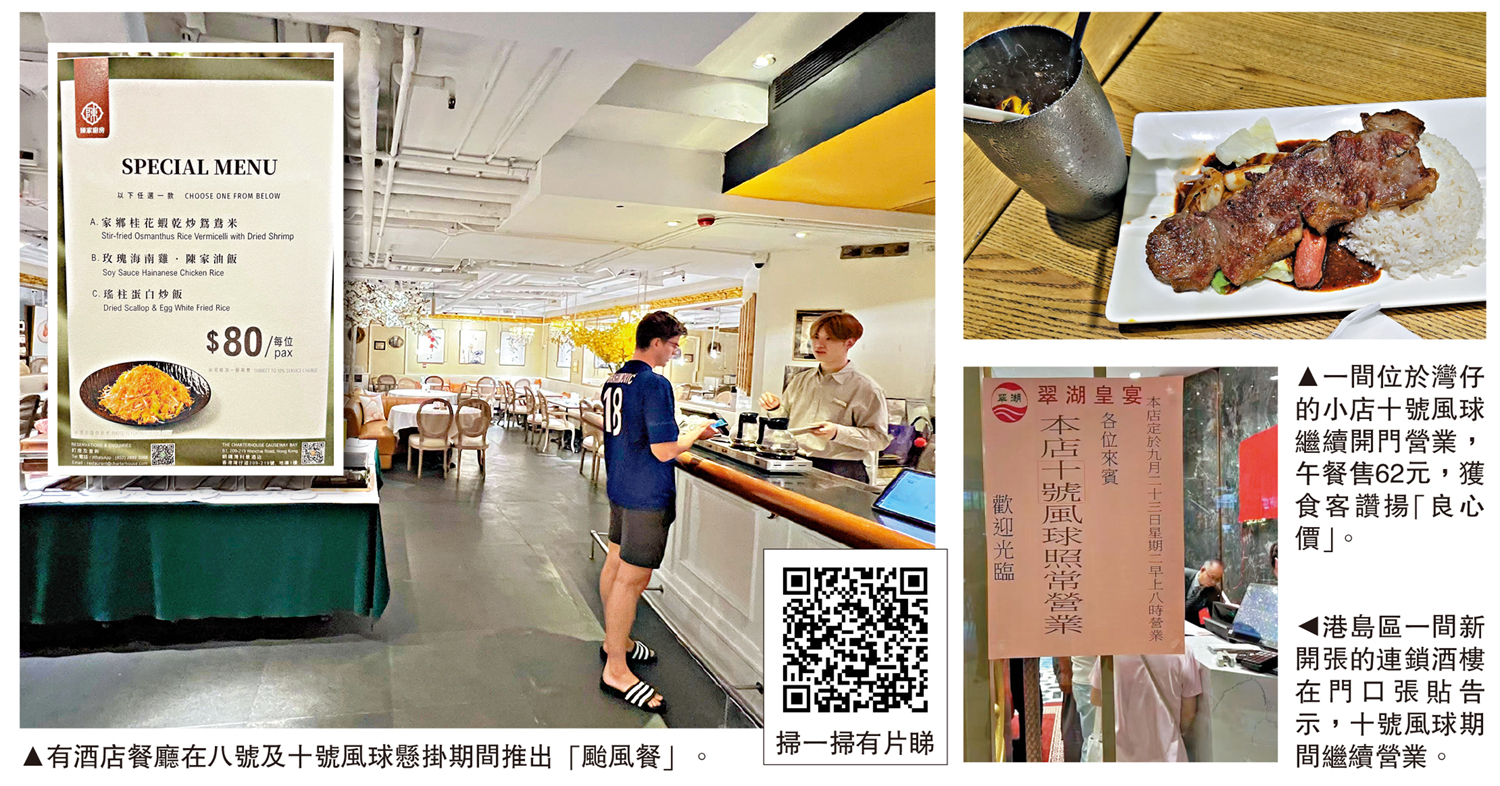 香港餐飲聯業協會表示,八號或十號風球期間,八成食肆不開門,估計餐飲業一天損失逾兩億元生意額,小部分連鎖食肆或小店繼續營業,基於競爭及避免食客不滿,已經甚少加價。\大公報記者 賴振雄 易曉彤 戴靜文