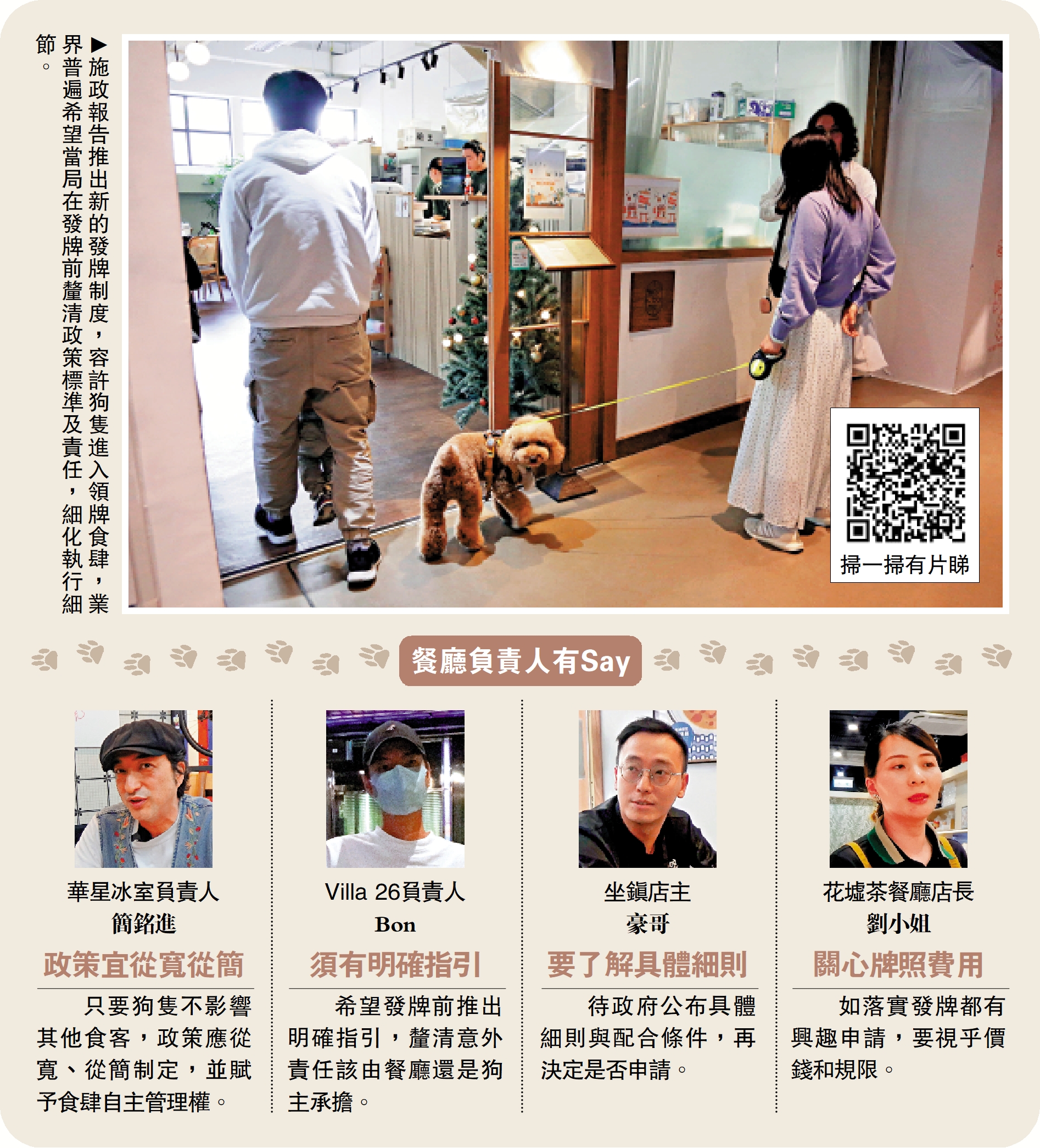 「我有興趣申請牌照!覺得寵物能和主人一起用餐,雙方都會更開心。」雞湯麵店「坐鎮」店主豪哥同樣有意申請牌照,他透露,餐廳共兩層,已計劃將上層改造為寵物友善樓層,通過分層管理確保不影響其他食客;愛狗人士可選擇到上層就座,不喜寵物的食客則留在下層。考慮到店舖空間有限,豪哥提出可能會要求狗隻佩戴口罩、盡量不落地等要求;對於衞生問題,他則認為「狗主清楚寵物的排便規律,不太擔心大小便問題」。不過,豪哥也表示,最終是否申請,仍需等政府公布具體細則與配合條件後再做決定。