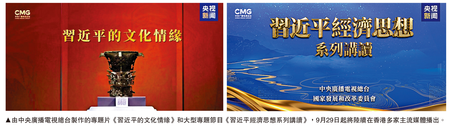 【大公報訊】據央視新聞報道:在慶祝中華人民共和國成立76周年之際,由中央廣播電視總台製作的專題片《習近平的文化情緣》和大型專題節目《習近平經濟思想系列講讀》,今日(9月29日)起將陸續在香港電台電視頻道和新媒體平台、大公文匯網和點新聞等平台播出。