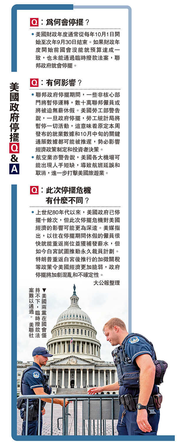 •上世紀80年代以來,美國政府已停擺十餘次,但此次停擺危機對美國經濟的影響可能更為深遠。美媒指出,以往在停擺期間休假的僱員很快就能重返崗位並獲補發薪水,但如今白宮試圖推動永久裁員計劃。特朗普重返白宮後推行的加徵關稅等政策令美國經濟更加脆弱,政府停擺將加劇混亂和不確定性。