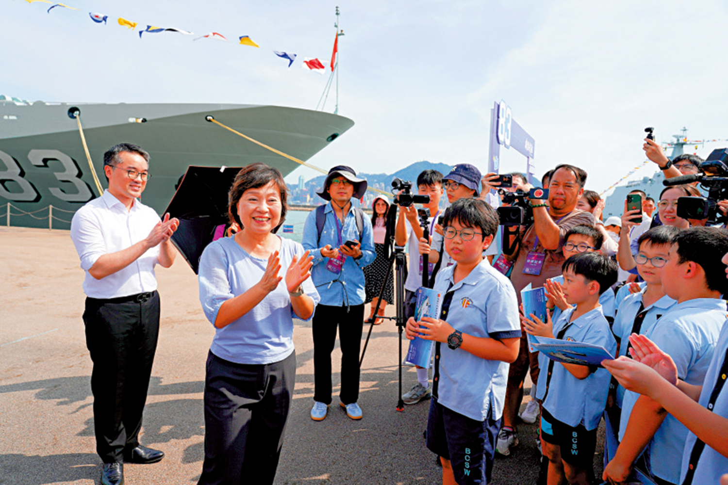 廠商會蔡章閣中學的學生們一起揮舞着國旗高聲祝福:「國家繁榮昌盛!」中四的何同學表示,自己透過登上戚繼光艦、沂蒙山艦,進一步了解到國家軍事發展的諸多成就,收穫了不少知識。國家在科技領域的發展成果令她深感自豪。 大公報記者 龔學鳴\大公報記者 龔學鳴