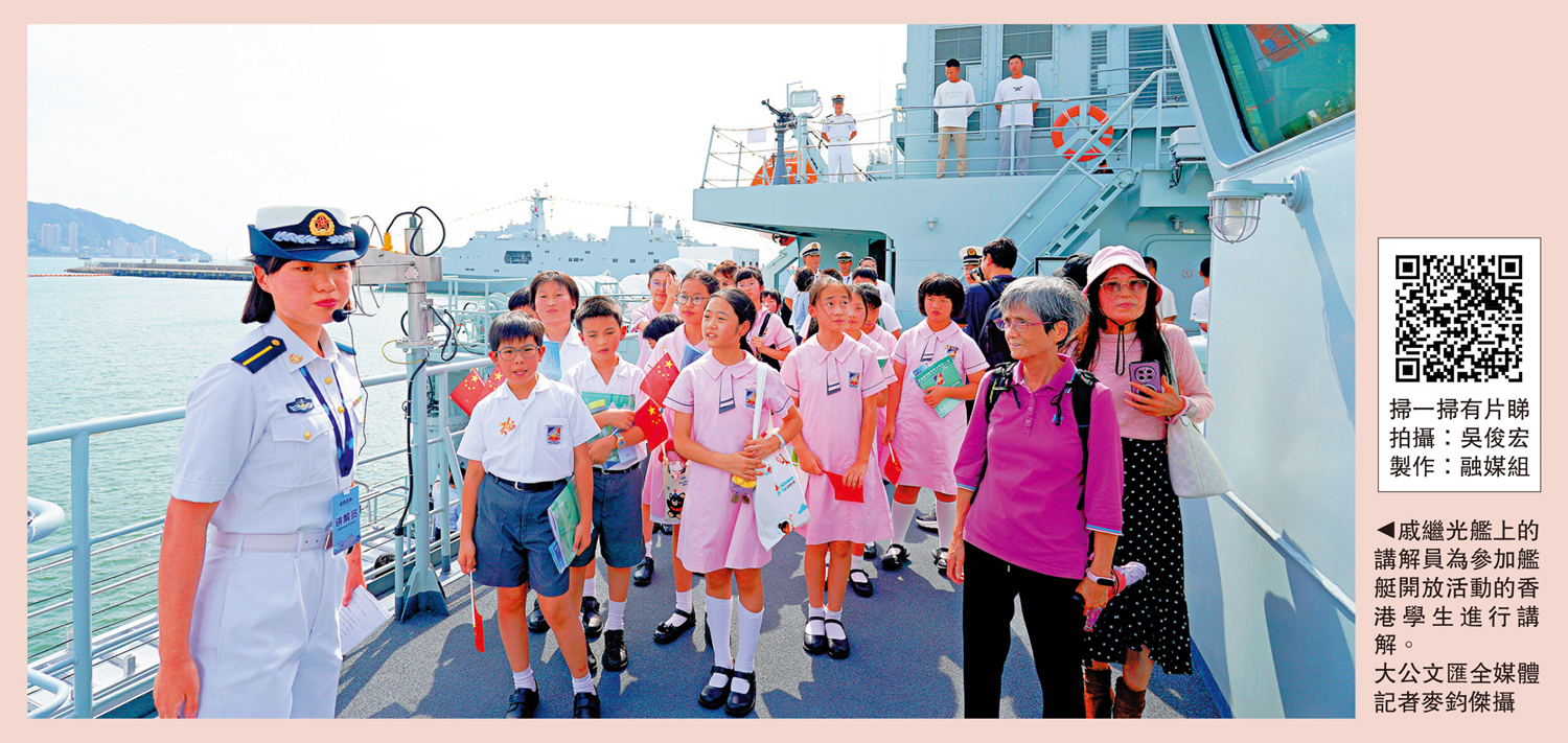 「國家的強大讓我感到無比驕傲。」上艦參觀的學生及市民難掩激動心情,紛紛表示此次登艦使他們對國家海軍建設與科技實力有了更直觀的感受。「親眼見到國家軍事裝備如此先進,我們很有安全感!」\大公報記者 吳俊宏