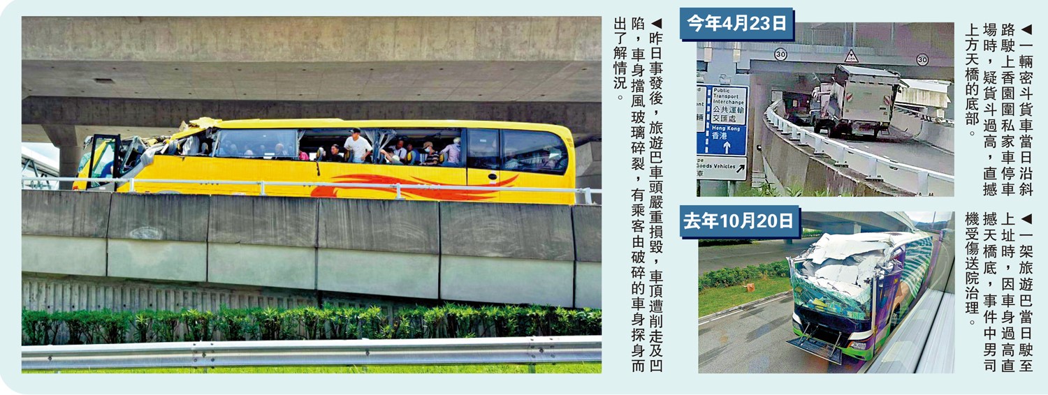 翻查資料,去年10月,一輛旅遊巴沿涉事的道路上斜時,因車身過高,撞向行人天橋底部。今年4月,一輛貨車的車斗撞向行人天橋的底部,車斗被撞至鬆脫,事件無人受傷。