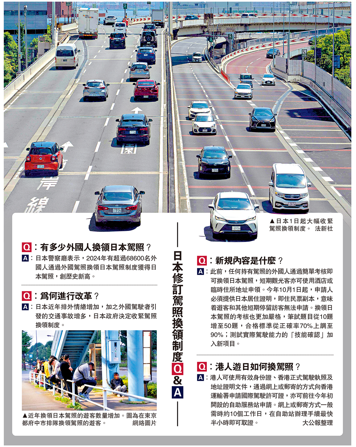 A:此前,任何持有駕照的外國人通過簡單考核即可換領日本駕照,短期觀光客亦可使用酒店或臨時住所地址申領。今年10月1日起,申請人必須提供日本居住證明,即住民票副本,意味着遊客和其他短期停留訪客無法申請。換領日本駕照的考核也更加嚴格,筆試題目從10題增至50題,合格標準從正確率70%上調至90%;測試實際駕駛能力的「技能確認」加入新項目。