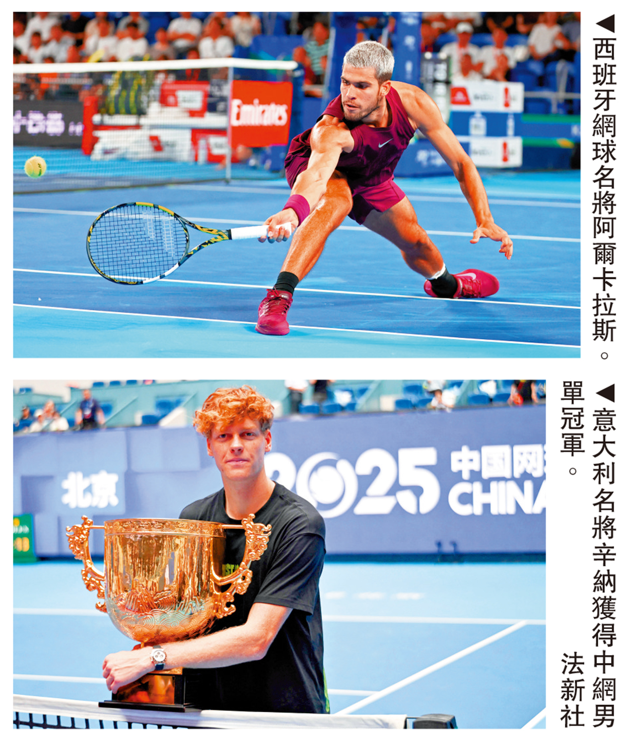 10月1日,2025中國網球公開賽男子單打決賽在國家網球中心鑽石球場打響。賽會頭號種子、現世界排名第2的意大利選手辛納以大比分2:0(6:2、6:2)擊敗美國19歲新星勒納·錢,繼2023年後再度捧起中網男單冠軍獎盃。辛納特意在鏡頭上寫下了「謝謝」。他表示,兩年前在中網奪冠是自己職業的轉折點,在這裏他打出了很多精彩的比賽,這是一輩子都難忘的。今年能夠再次拿下中網的冠軍,又是印象深刻的比賽,非常感謝這裏觀眾的支持。\大公報記者蘇雨潤