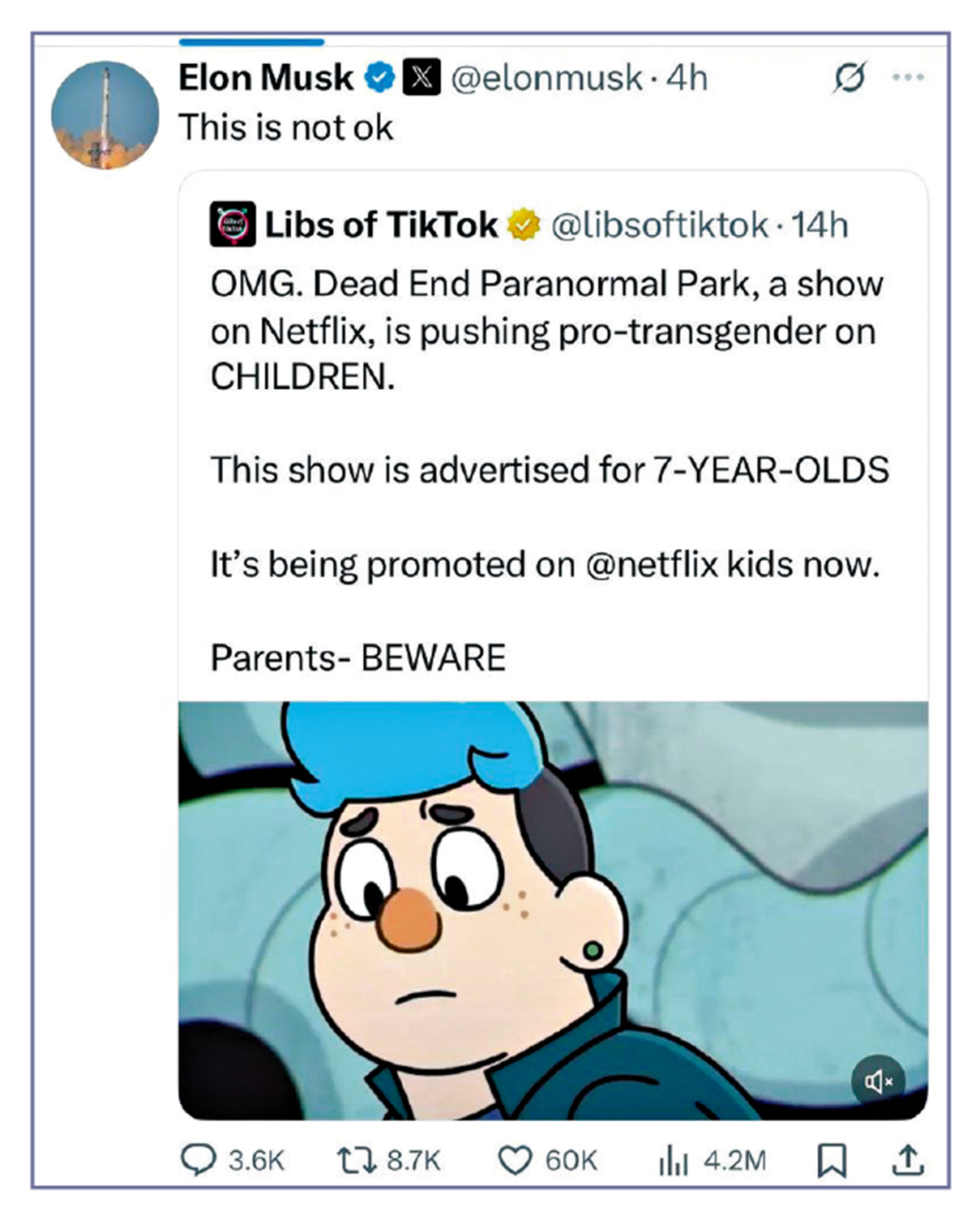 馬斯克稱,該動畫向年僅7歲的兒童宣傳「跨性別意識形態」,他於9月30日表示已終止訂閱Netflix。共和黨眾議員格林等政客也紛紛指責Netflix在兒童節目中宣傳跨性別。馬斯克還轉發一名用戶的帖子,該用戶稱Netflix「僱用了一個慶祝柯克被殺的人,並製作了向我的孩子推銷支持跨性別的內容。」馬斯克回覆該條貼文說「我也是」。