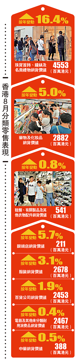 批發及零售界立法會議員邵家輝昨日表示,國慶黃金周假期的訪港旅客,不少都是遠程旅客,零售、化妝及奢侈品店舖人頭湧湧,金飾店和藥房也有大量顧客,形容整體銷售氣氛非常好。