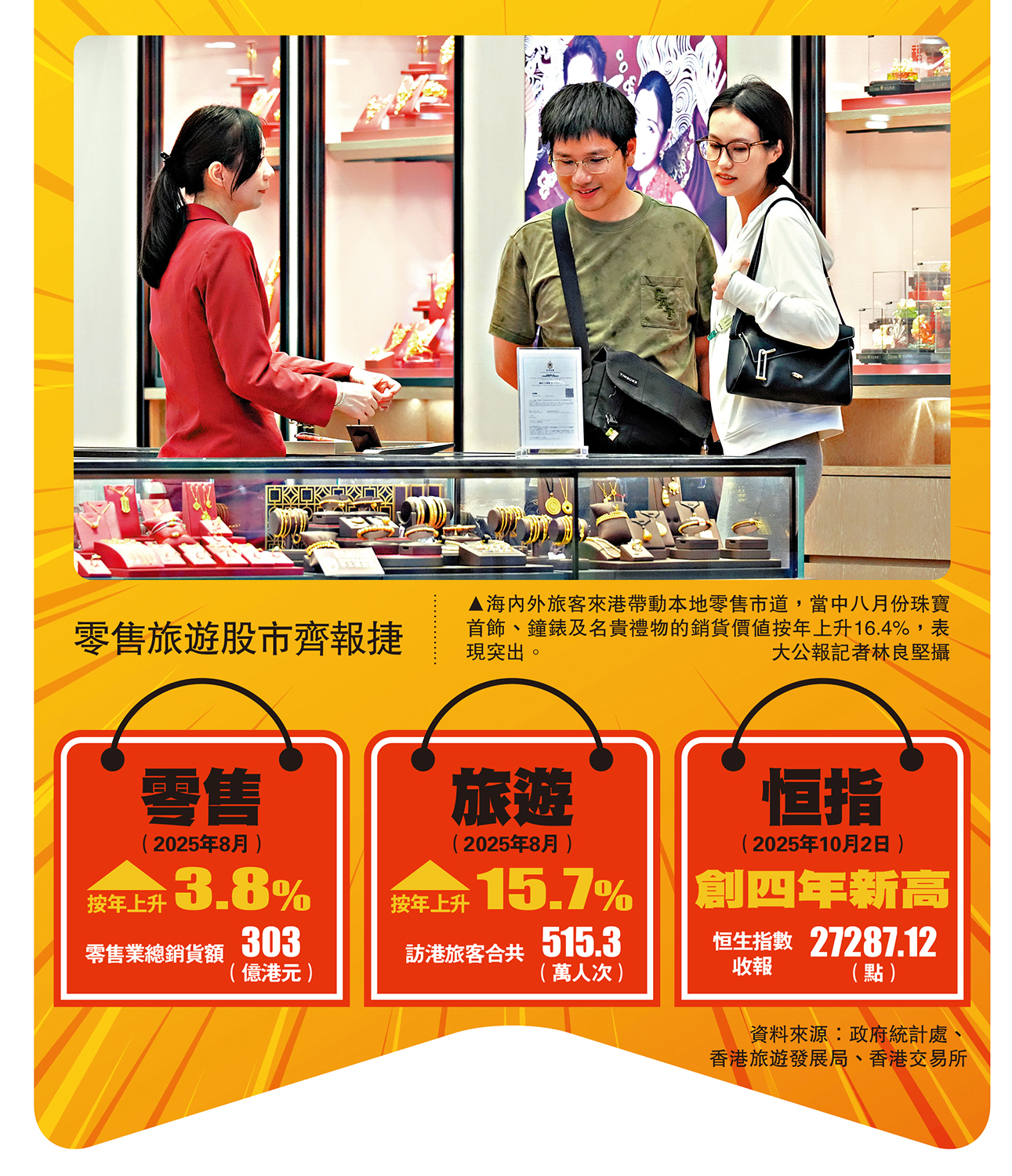 東亞銀行首席經濟師卓亮認為,內地及香港股市表現理想,財富效應對刺激消費有正面作用。同時,旅遊業復甦,盛事項目陸續推出,有助持續吸引訪港遊客,支持零售銷售。