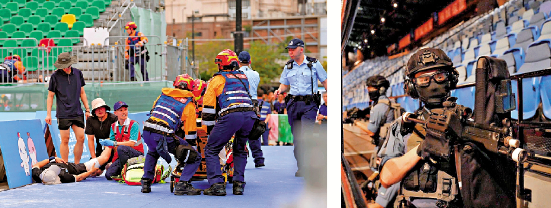 警方在過去一年已順利完成十五運會及殘特奧會所有場地的跨部門反恐及重大事故演習,在這次演練總結過往演習及測試賽的經驗,集中優化競賽流程、強化安全保障措施,並為各比賽場地及相關賽事安排最後階段的測試及演練,確保各項安排更臻完善。警方將與各持份者保持緊密聯繫,做好風險管理以及實地保安工作,確保十五運會及殘特奧會安全順利舉行。