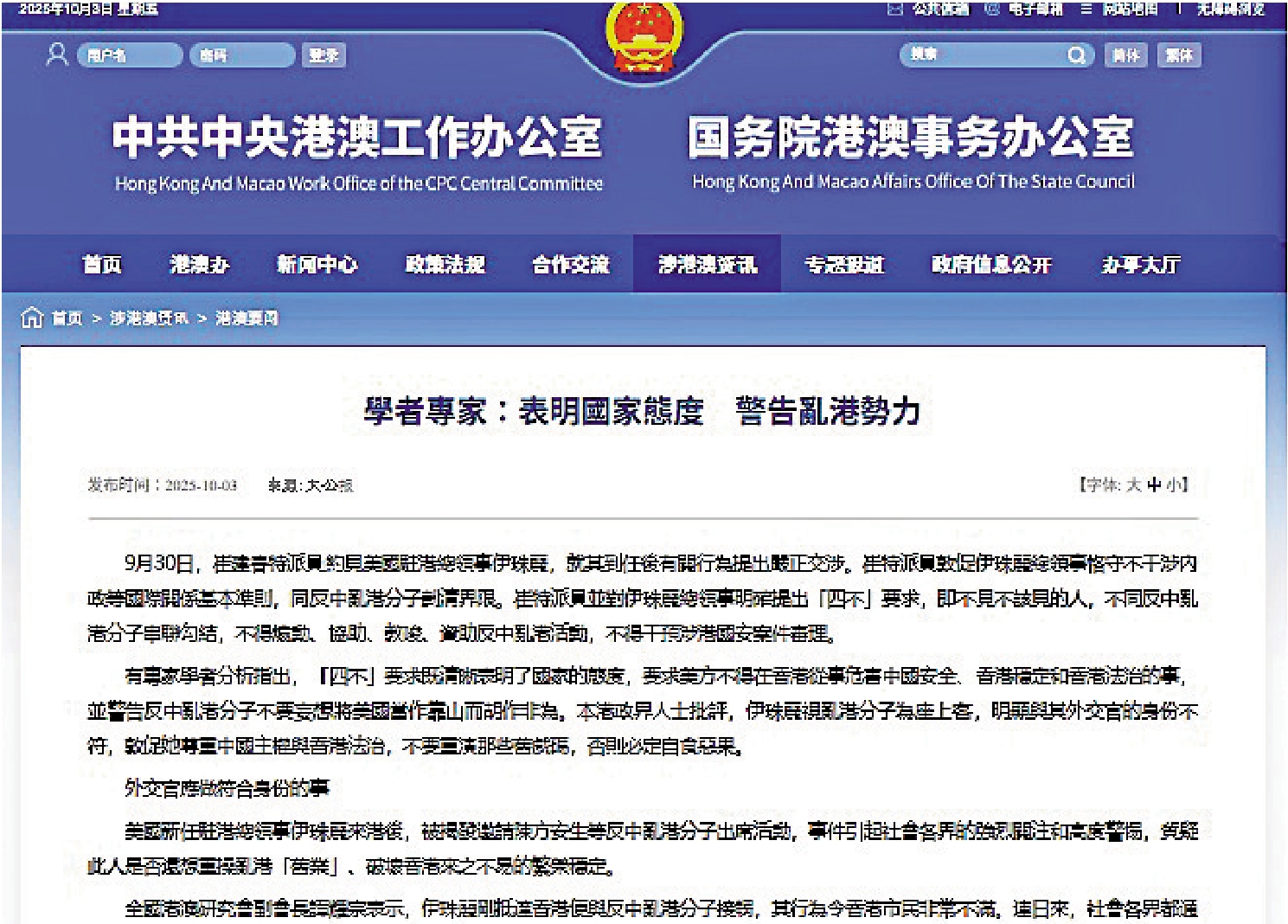 文章指出,外交部駐港公署特派員崔建春9月30日約見美國駐港總領事伊珠麗,就其到任後有關行為提出嚴正交涉,並對伊珠麗總領事明確提出「四不」要求。文章引述專家學者分析指出,「四不」要求清晰表明了國家的態度,要求美方不得在香港從事危害中國安全、香港穩定和香港法治的事,警告反中亂港分子不要妄想將美國當作靠山而胡作非為。政界人士批評,伊珠麗邀亂港分子做座上客,明顯與其外交官的身份不符,敦促她尊重中國主權與香港法制,不要重演那些舊戲碼,否則必定自食惡果。\大公報記者 龔學鳴、李清