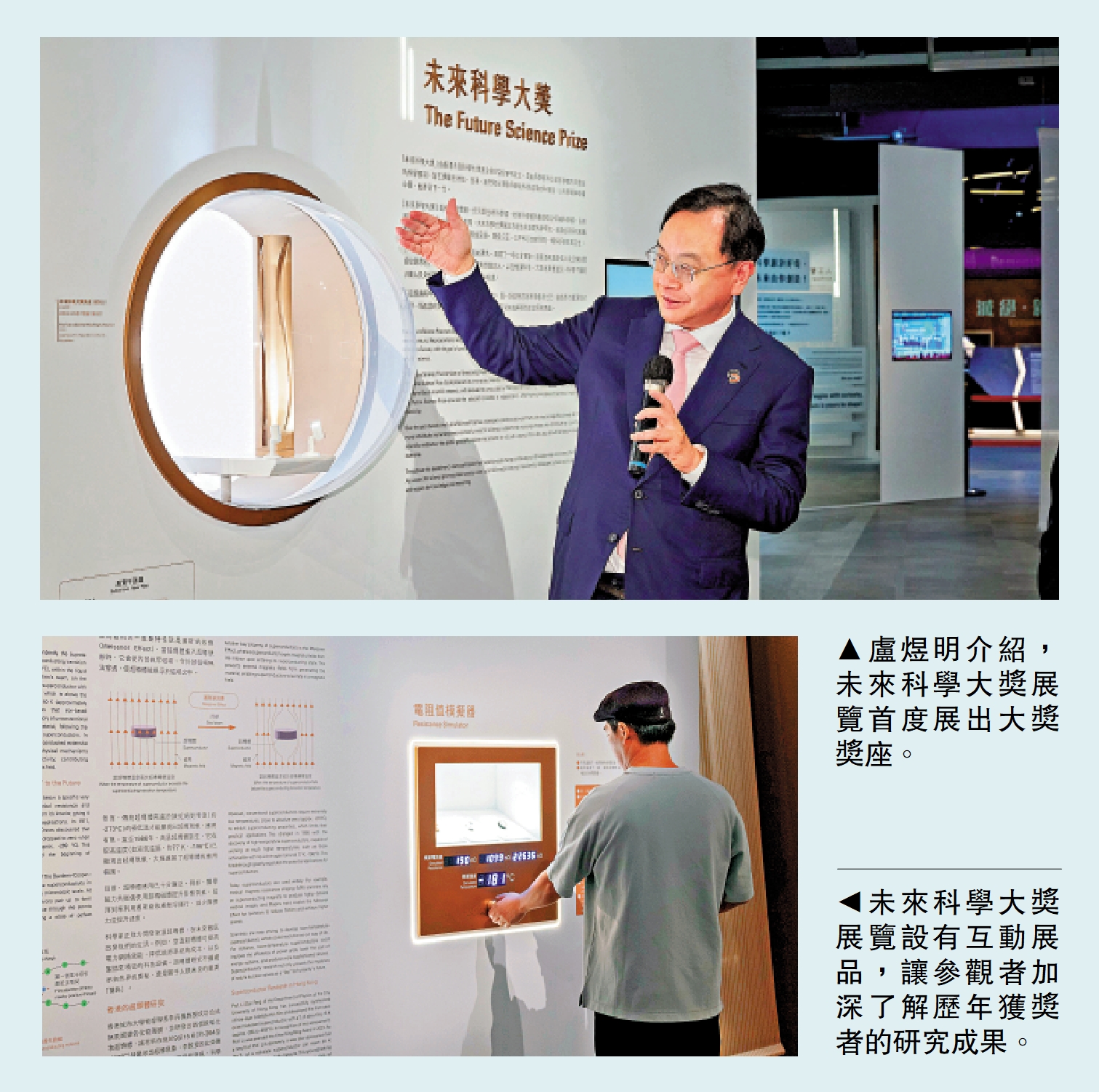 「2025未來科學大獎展覽」由即日起至本月29日(周三)在香港科學館舉行,展覽以「過去」、「現在」和「未來」為主題,介紹歷年獲獎科學家的研究歷程和成果,以及相關科學知識。首屆未來科學大獎的生命科學獎得主盧煜明昨日表示,希望展覽能激發年輕一代對科學的追求。\大公報記者 戴東