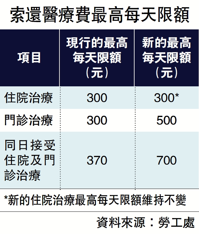 立法會於9月26日通過兩項決議,將《僱員補償條例》及《肺塵埃沉着病及間皮瘤(補償)條例》下門診治療的醫療費最高每天限額,由300元上調至500元;同一天接受住院及門診治療的醫療費最高每天限額,由370元調高至700元;住院治療的醫療費最高每天限額,則維持為300元。