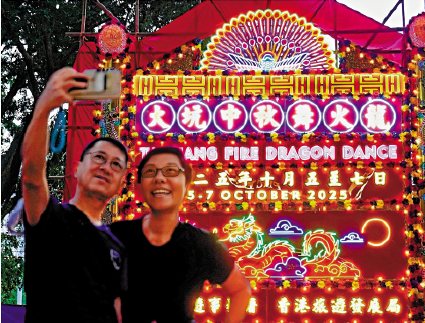 大公報記者昨日在現場觀察,不少市民及旅客在花牌前拍照打卡,「這個(花牌)太有趣了,沒見過,很有味道!」有旅客認為,花牌為中秋帶來氣氛,也很有趣。有30年紮作經驗的花牌師傅蔡榮基介紹,花牌紮作已有上百年歷史,與傳統舞火龍相結合,共同照亮中秋夜,喜上加喜。花牌近年加入越來越多新元素,如LED燈等,晚上拍照同樣絢麗,「不僅好打卡,更讓旅客一眼記住這獨有屬於香港的文化。」\大公報記者 王亞毛