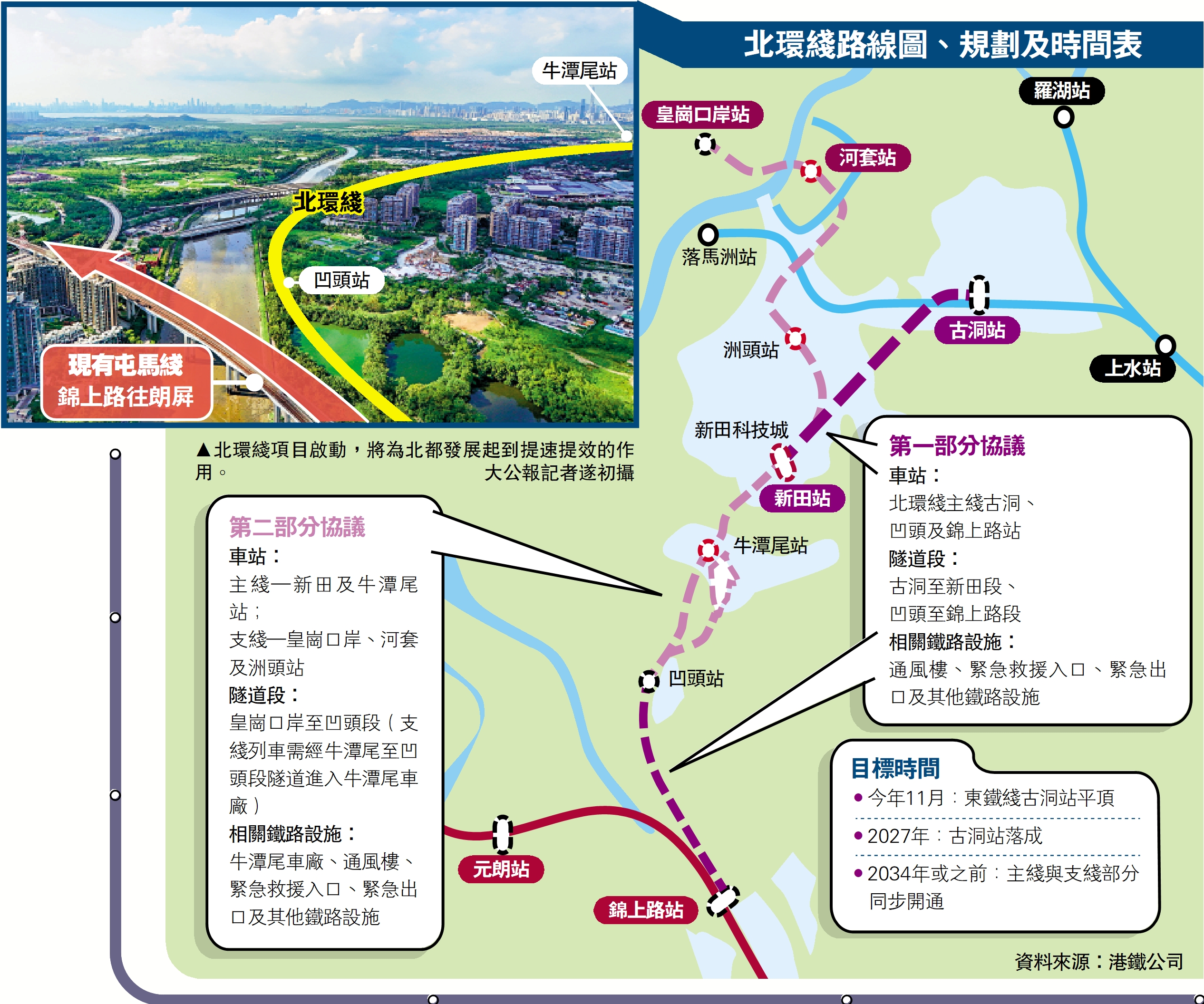 歐陽伯權強調,港鐵會繼續善用創新的技術和透過高效管理,推進工程,以達至不遲於2034年主綫及支綫同步開通的目標。北環綫項目下的東鐵綫古洞站,整體建造進度良好,預計於今年11月平頂,目標於2027年開通,屆時將成為港鐵第100個車站,率先服務古洞北新發展區。