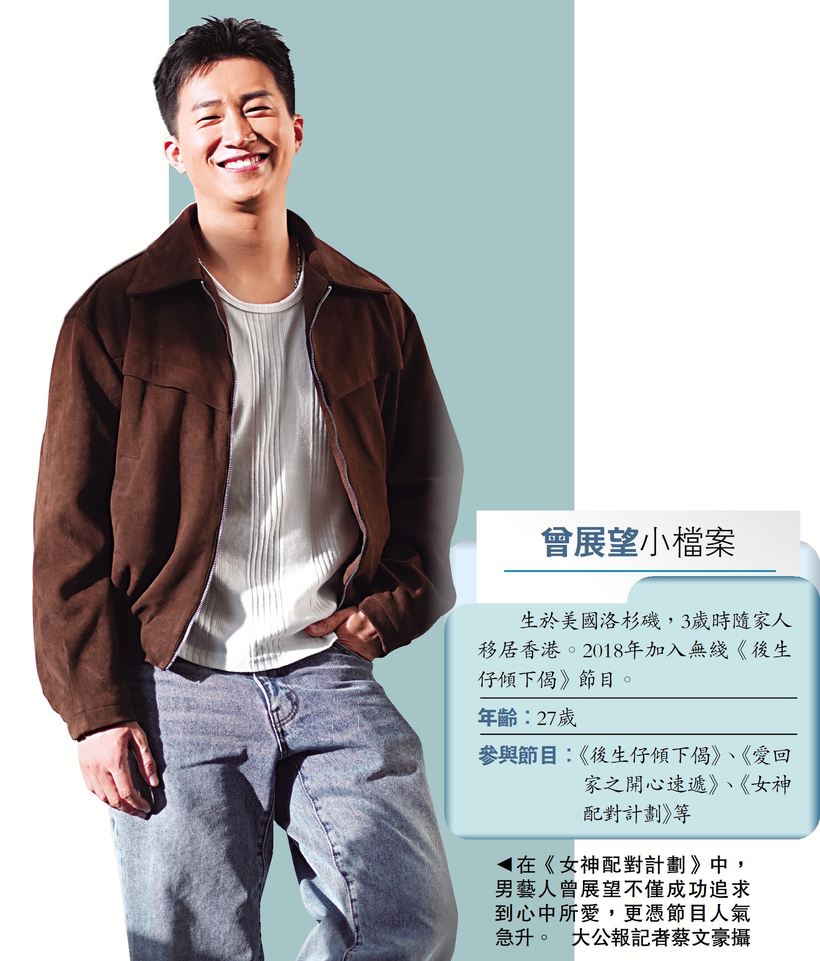 憑藉無綫首個戀愛真人騷《女神配對計劃》人氣急升的男藝人曾展望(GM),不單透過此節目收穫愛情,成功追求到心中所愛葉蒨文(Sophie),二人更成為大受歡迎的CP,工作接踵而來,成為GM事業上的轉折點。GM更憑其陽光笑容及樂觀性格,獲封新一代「男神」。面對突如其來的一切,他感謝大家的支持,但認為自己距離心目中的目標尚有很遠距離,希望努力做好自己,才可以有組織家庭的條件。