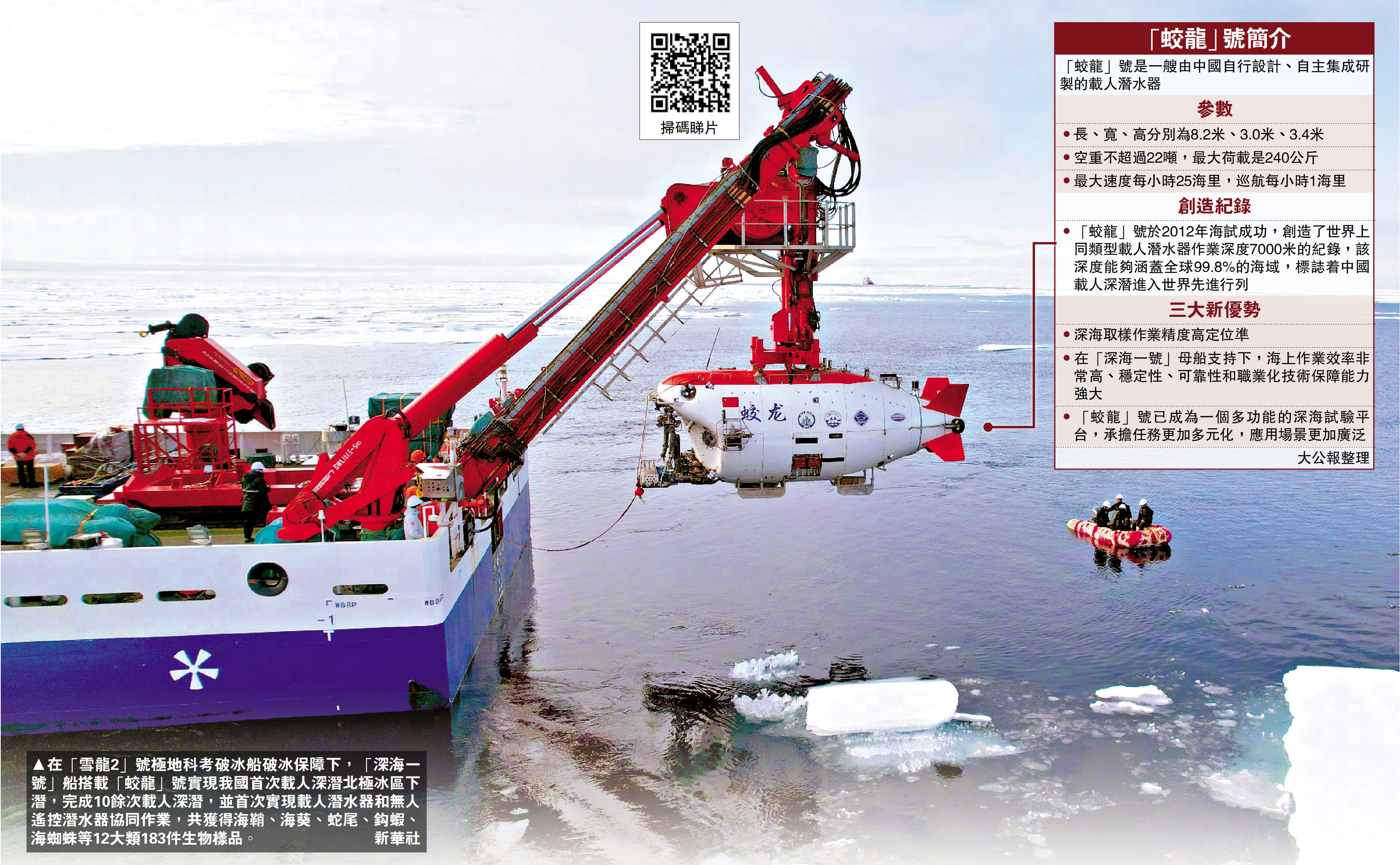 在「雪龍2」號船保障支持下,「深海一號」船搭載「蛟龍」號實現我國首次載人深潛北極冰區下潛,完成10餘次載人深潛,並首次實現雙潛器─「蛟龍」號載人潛水器和ROV(無人遙控潛水器)在北極海域水下協同作業:後者變身「超級助手」,拍攝「蛟龍」號在海底取樣視頻,並協助收集樣本。科考另一突破是用上「AI識別+環境DNA檢測」創新調查模式。此次考察「蛟龍」號大豐收,獲得海鞘、海葵、蛇尾、鈎蝦、海蜘蛛等12大類183件生物樣品。