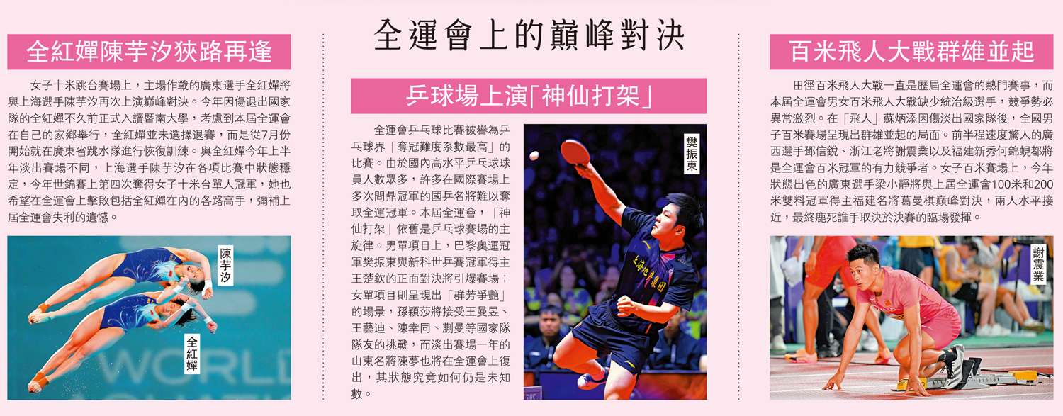 田徑百米飛人大戰一直是歷屆全運會的熱門賽事,而本屆全運會男女百米飛人大戰缺少統治級選手,競爭勢必異常激烈。在「飛人」蘇炳添因傷淡出國家隊後,全國男子百米賽場呈現出群雄並起的局面。前半程速度驚人的廣西選手鄧信銳、浙江老將謝震業以及福建新秀何錦蜆都將是全運會百米冠軍的有力競爭者。女子百米賽場上,今年狀態出色的廣東選手梁小靜將與上屆全運會100米和200米雙料冠軍得主福建名將葛曼棋巔峰對決,兩人水平接近,最終鹿死誰手取決於決賽的臨場發揮。