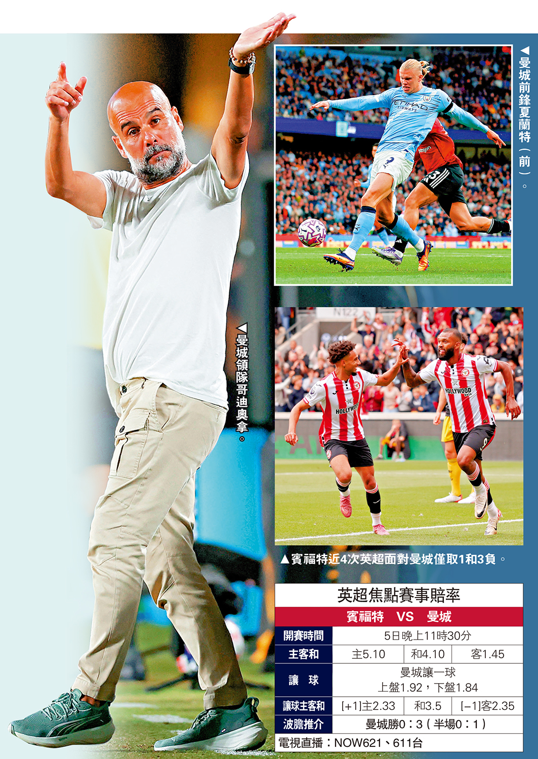 曼城今晚將在英超作客對賓福特,回想3年前的4月20日,曼城英超主場大勝白禮頓3:0,迎來哥帥執掌曼城後各項賽事的第250場勝利,今仗亦適逢哥帥力爭在英超的第250場勝利,眾將肯定齊心爭取大勝作慶賀,賓福特近4次英超面對曼城均場失球高達兩球,今仗難阻曼城達標,「讓球」曼城讓一球仍可捧上盤。(NOW621、611台今晚11時30分直播)