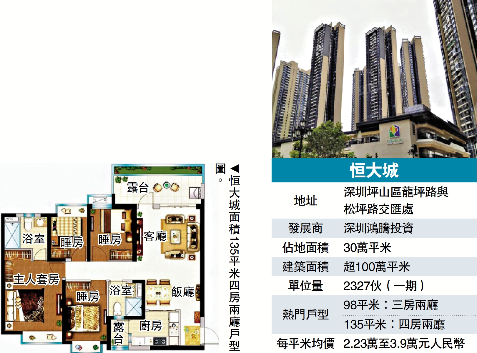 恒大城主力戶型為面積98至156平米單位,間隔由三房至五房。98平米三房戶,間隔方正,客飯廳一體化設計,主人套房連窗台;135平米四房戶採用雙露台布局,主人套房空間寬敞;156平米五房戶型,南北通透,動靜分區明確,適合多代同堂家庭。所有戶型均注重功能性與舒適度平衡,部分樓幢可俯瞰園林景觀,提升居住品質。目前每平米均價2.23萬至3.9萬元人民幣。