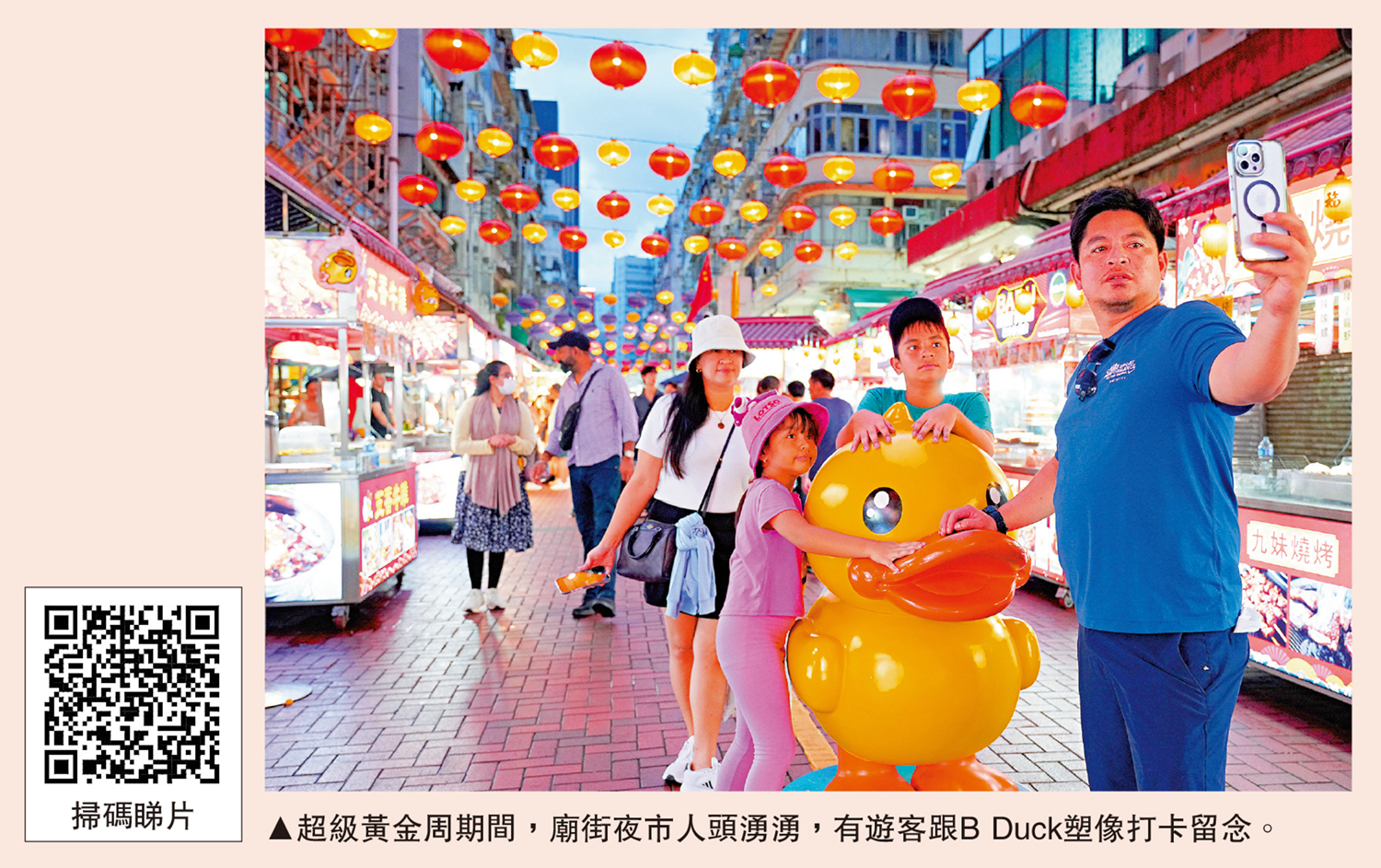 國慶中秋超級黃金周假期已至中段,截至昨晚9時,首四日累計逾99.4萬旅客訪港人次,內地旅客佔近87.1萬人次,按年升6.2%。文體旅局局長羅淑佩表示,全年旅客人次有望突破4900萬,旺丁又旺財。各旅遊旺區都人頭湧湧,帶動各行業受惠,大公報記者昨日在廟街夜市觀察,三號風球下仍有不少遊客專程前來。