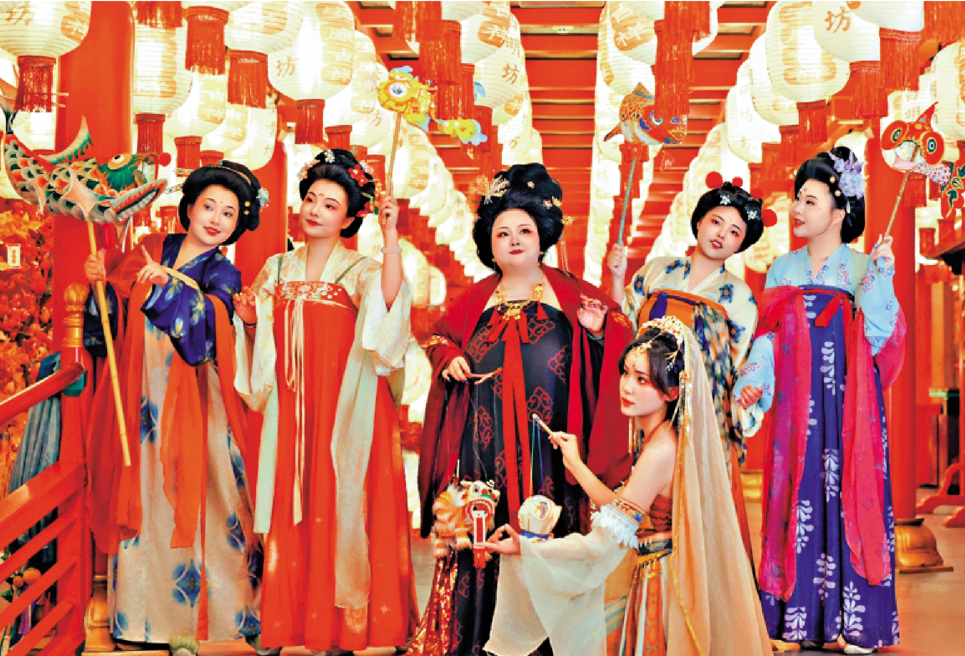 「唐朝妝造確實是太美了。」王嫣然說,對於當代年輕人而言,旅行的意義更多的在沉浸式體驗。走在長安十二時辰唐長安城街道上,王嫣然不時與文臣墨客、翩翩公子,千金小姐等身着各種服飾的「唐潮人」相向而過,亦有唐妝同行者互相行「叉手禮」問好。萬國衣冠齊聚的景象,還有眼前的景和人,交織成一幅活的盛唐市井圖,讓王嫣然剎那間竟有點不知「今夕是何年」。