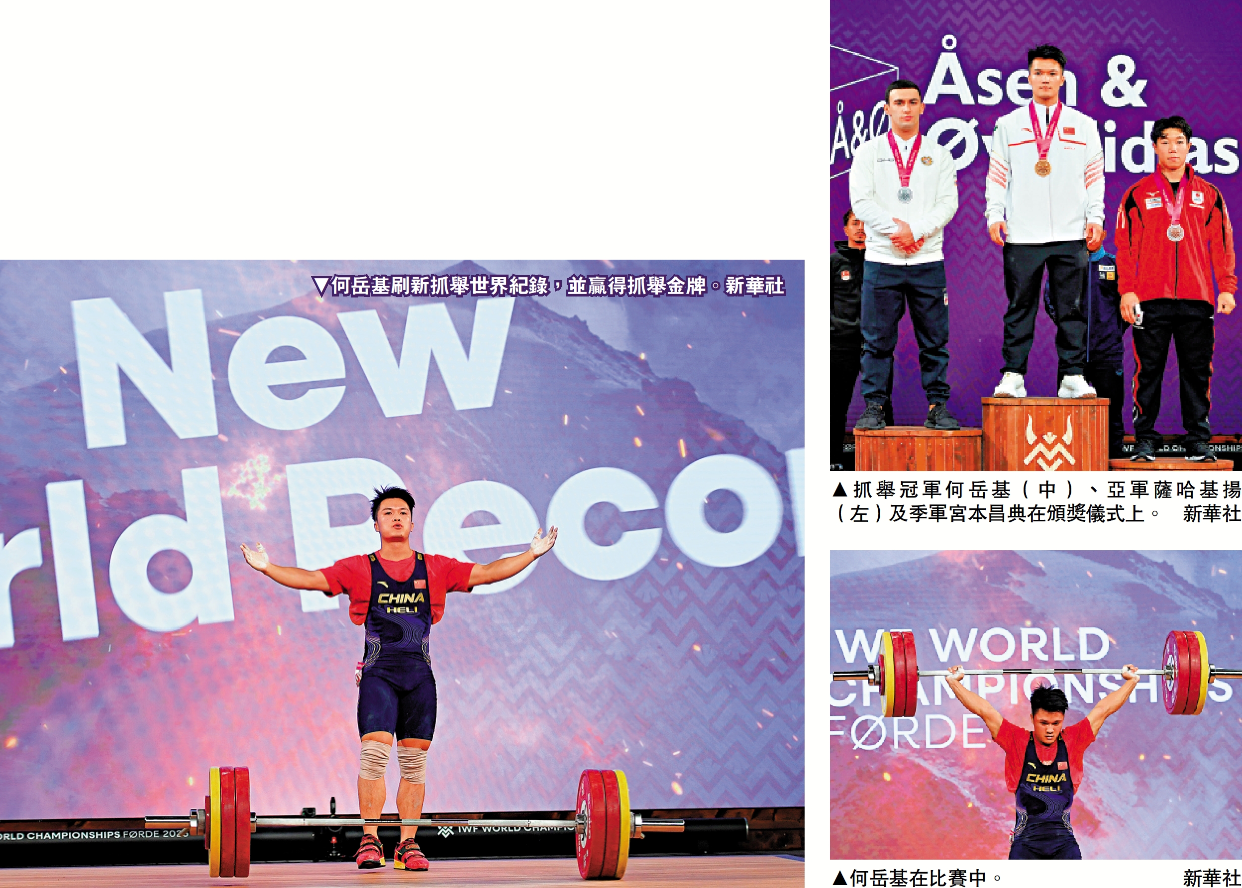 【大公報訊】據新華社報道:在男子71公斤級別的抓舉比賽中,何岳基在第二、三次試舉中兩度刷新世界紀錄。憑藉第二把舉起157公斤,他已經拿到單項頭名,但為了拉開差距,第三把再增加了3公斤的重量並試舉成功。挺舉不是何岳基的強項,他穩紮穩打以184公斤的成績結束挺舉比賽。何岳基的成績定格在抓舉160公斤、挺舉184公斤,總成績344公斤,收穫抓舉金牌、總成績銅牌。