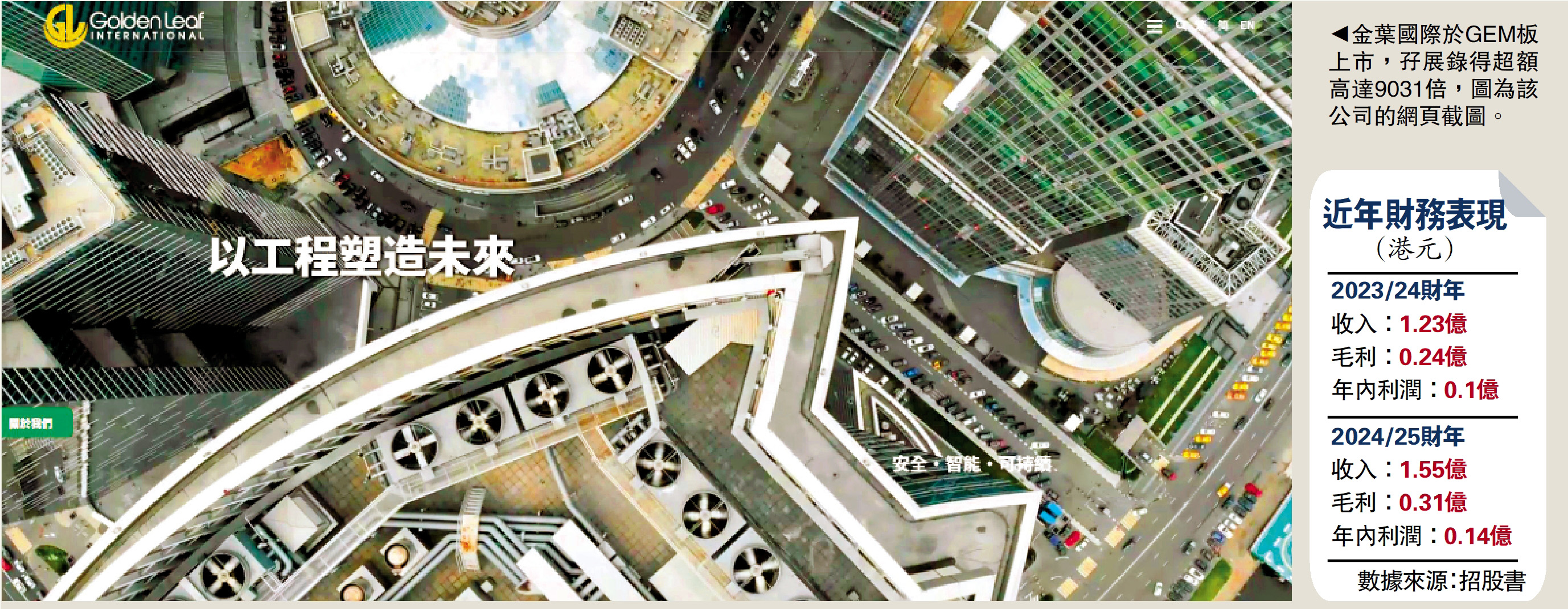 GEM板今年首宗IPO即成為超購王,金葉國際(08549)昨日截止認購,據券商初步統計,孖展錄得超額認購9031倍,打破早前上市排行榜首的大行科工(02543)7557倍的紀錄。這間本地機電工程承建商是次IPO(首次公開募股)計劃發售1億股,香港公開發售佔10%,其餘為國際配售,每股招股價介乎0.45元至0.65元,集資4500萬元至6500萬元。金葉國際預期在10月10日於GEM板掛牌,同人融資為獨家保薦人。\大公報記者 蔣夢宇