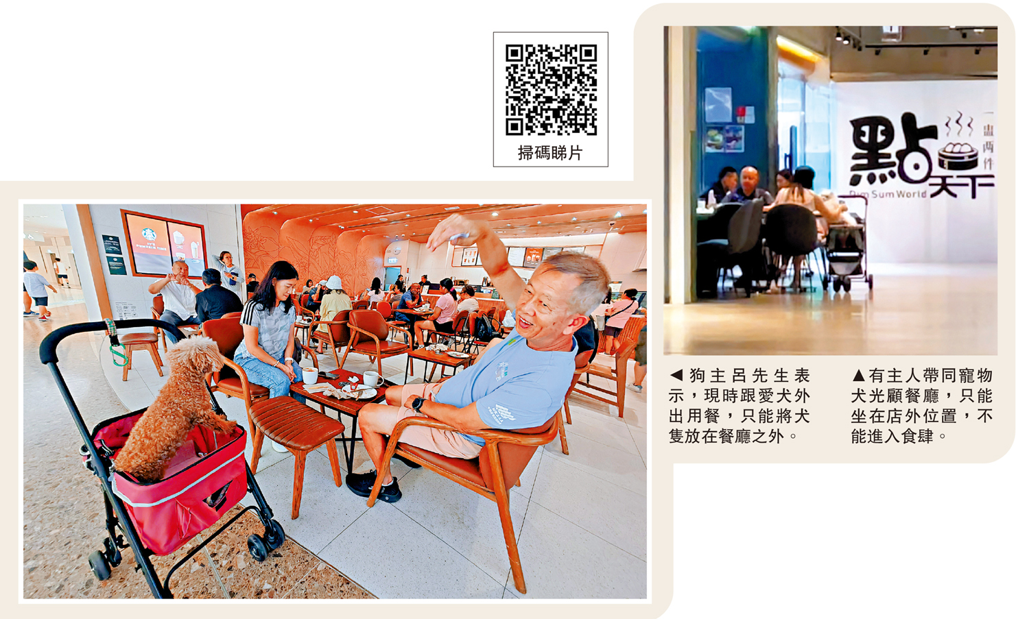 周末時分,狗主呂氏夫婦帶同愛犬來到將軍澳的咖啡店用餐,但坐在寵物車的愛犬卻要放置在餐廳界線的公眾地方,不能與主人同坐。呂先生指按《食物業規例》,若食肆讓狗隻進入餐廳,相關餐廳會被罰,據他所知西貢有不少食肆因此受罰。法例以外,「最大的阻力源於顧客,有些人不愛狗,又無養狗。」呂先生坦言,有些不愛狗的客人會不斷投訴,餐廳亦感為難。他指食環署需修改相關法例後,才可推出讓寵物進入餐廳的新牌照,希望該署能盡快修例,並且在餐廳內劃分清楚寵物用餐的範圍。