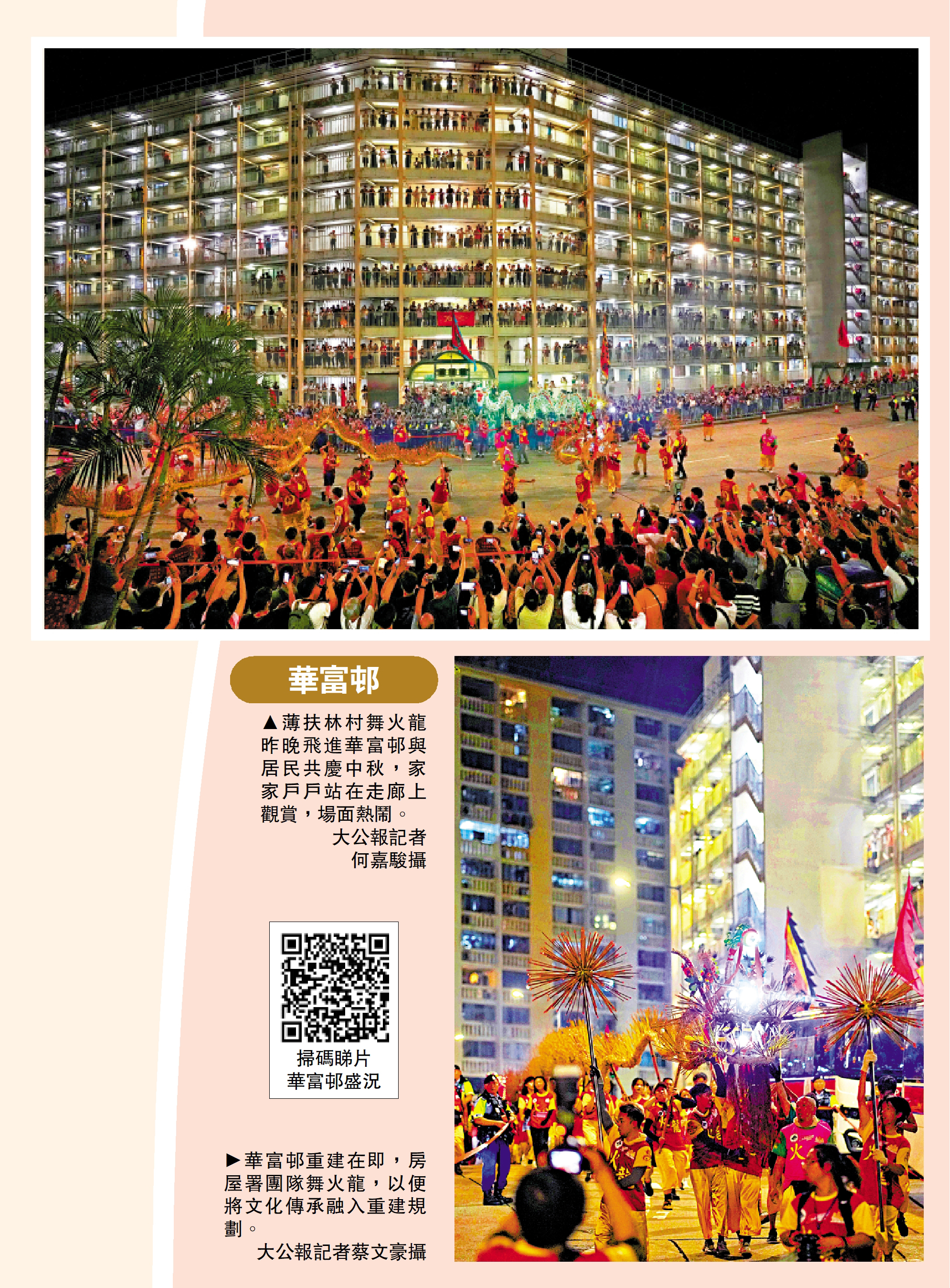 【大公報訊】記者肖泓宇報道:昨晚中秋佳節,擁有逾百年歷史的薄扶林村舞火龍在華富邨起舞。面對華富邨2027年啟動重建,房屋署提前部署,調整建築設計保留火龍路線,在首階段重建期間特設通道供火龍通過;更派團隊親身體驗舞火龍,將文化傳承融入重建規劃,在設計華富北接收邨時預留16米及8米的空間,支援舞火龍活動的「蟠龍出洞」及「補香」儀式。