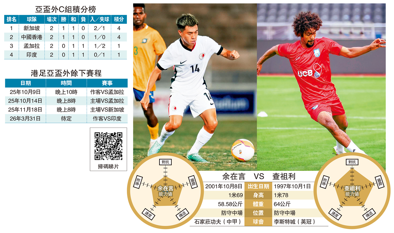 因為費蘭度受傷,港隊主帥韋斯活可能派出余在言於中場對位查祖利,前者今年在中甲石家莊功夫上陣機會較少影響狀態。「得中場、得天下」,查祖利坐鎮孟加拉中場,余在言若能成功限制對方,可為港足增添勝算。而另一位有望上陣的防中球員則為顏卓彬,轉投大埔的他在新東家的上陣時間亦不算太多。面對「中場拚搶大戰」,將考驗韋斯活用人及戰術調配的能力。