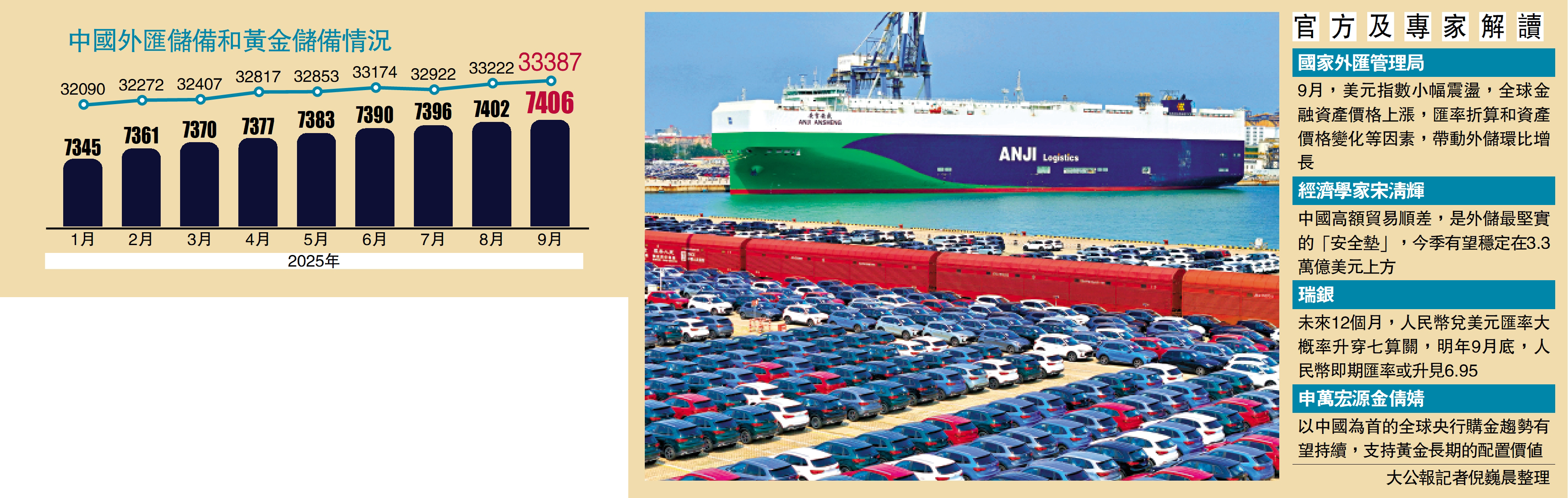 中國人民銀行最新數據顯示,截至9月末,中國外匯儲備規模達到33386.58億美元,按月增加165億美元,增幅0.5%,實現連續兩個月環比增長。國家外匯管理局指出,9月份受主要經濟體宏觀數據、貨幣政策及市場預期等因素影響,美元指數小幅波動,全球金融資產價格整體上漲。在匯率折算與資產價格變動共同作用下,中國外匯儲備規模得以繼續上升。分析認為,中國經濟向好的基本面並未改變,未來外儲規模有望繼續保持穩定。\大公報記者 倪巍晨
