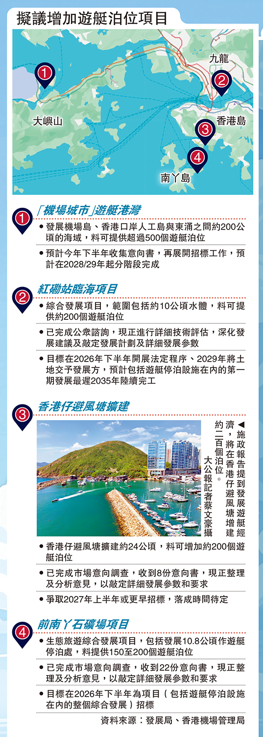 •發展機場島、香港口岸人工島與東涌之間約200公頃的海域,料可提供超過500個遊艇泊位