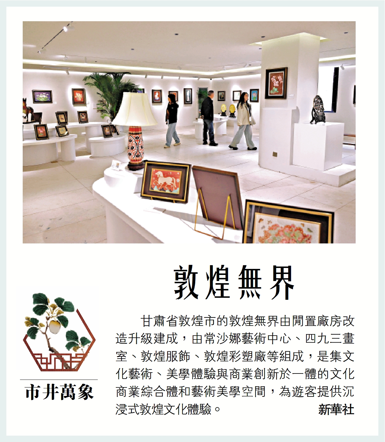 甘肅省敦煌市的敦煌無界由閒置廠房改造升級建成,由常沙娜藝術中心、四九三畫室、敦煌服飾、敦煌彩塑廠等組成,是集文化藝術、美學體驗與商業創新於一體的文化商業綜合體和藝術美學空間,為遊客提供沉浸式敦煌文化體驗。\新華社