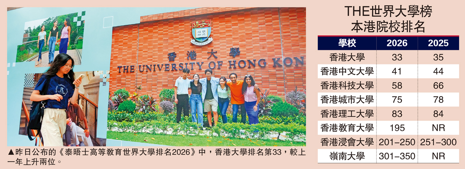 昨日,泰晤士高等教育(THE)公布《泰晤士高等教育世界大學排名2026》,香港8間大學上榜,且所有大學排名均較去年提升,其中香港教育大學和嶺南大學為新上榜,香港大學位列第33名,為「留學香港」品牌增加聲譽。