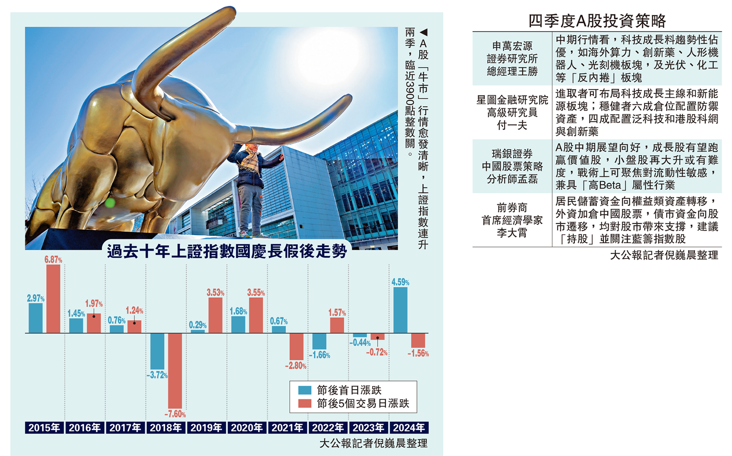 A股「牛市」行情愈發清晰,上證指數上季累升12.73%,連升兩季,臨近3900點整數關;深證成指上季累升29.25%,升幅為2019年二季度以來最勁。分析稱,儘管國慶長假前A股出現調整,但中期展望並無顯著下行風險。考慮到10月是關鍵的政策布局窗口期,隨着市場調整的兌現,四季度A股「牛市」料持續,建議聚焦科技成長方向,以及A股從「結構牛」向「全面牛」行情轉化的「反內捲」關鍵主題。\大公報記者 倪巍晨