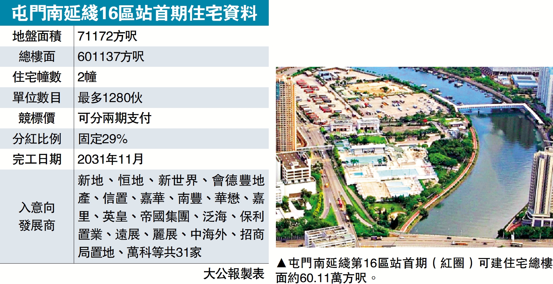 【大公報訊】港鐵(00066)上周為屯門南延綫第16區站首期住宅項目完成邀收發展意向書程序,等不及特區政府公布本季賣地計劃,昨日正式邀請發展商及財團入標競投項目發展權。項目招標條款簡單,競爭者價高者得。港鐵要求將來項目的賣樓收益,固定收取29%分紅。