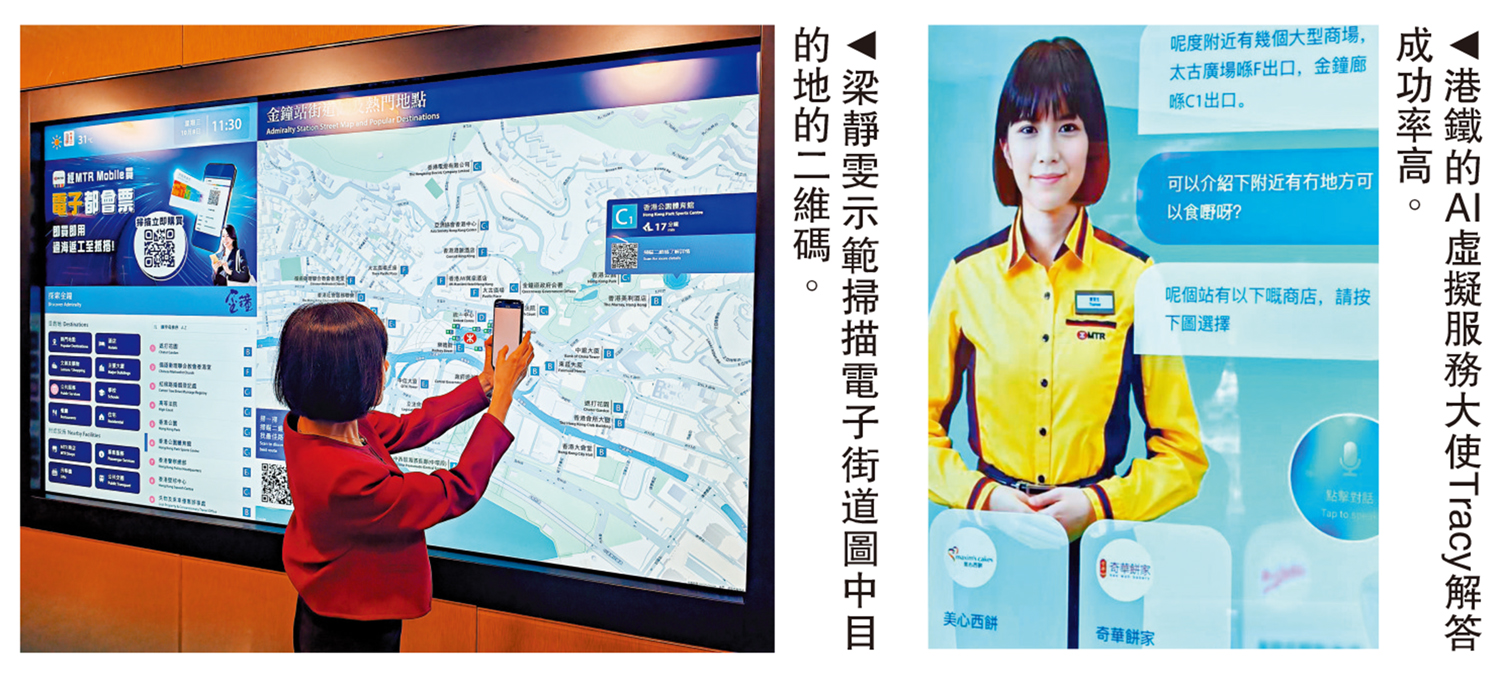 【大公報訊】記者肖泓宇報道:為提升乘客出行體驗,港鐵增加應用AI人工智能,包括昨日在金鐘站推出「電子街道圖及出口指示牌」,新增互動、分類搜尋等功能,並革新導向指示系統,乘客可透過點擊屏幕或掃描二維碼獲取最便捷的路線信息。