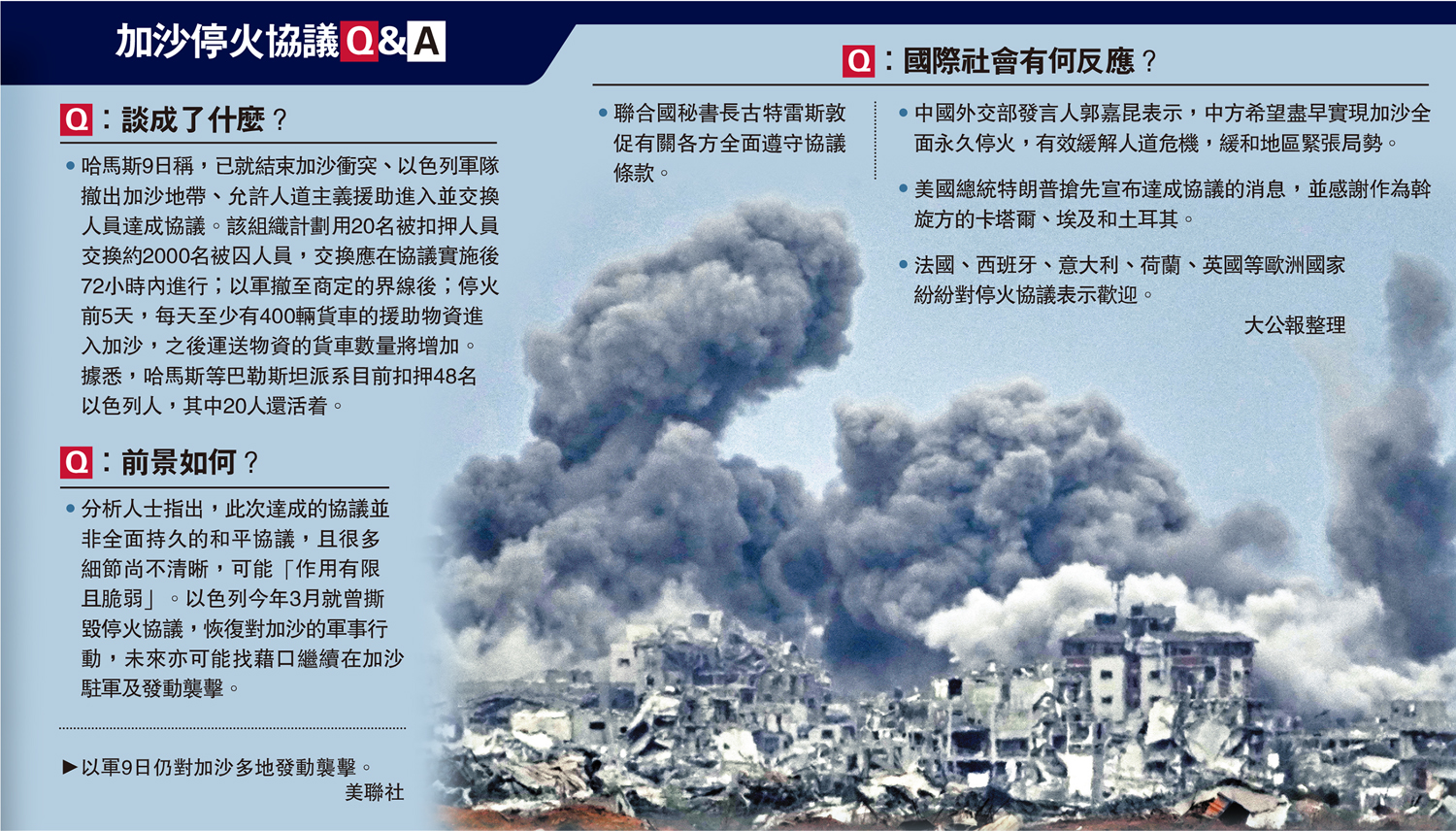 •分析人士指出,此次達成的協議並非全面持久的和平協議,且很多細節尚不清晰,可能「作用有限且脆弱」。以色列今年3月就曾撕毀停火協議,恢復對加沙的軍事行動,未來亦可能找藉口繼續在加沙駐軍及發動襲擊。