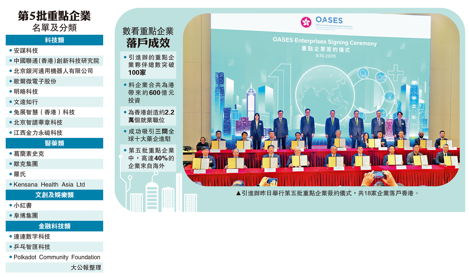 香港創科及營商環境不斷優化,吸引愈來愈多重量級企業落戶香港。引進辦昨日舉行第五批重點企業簽約儀式,18家落戶香港的重點企業中,更有三家全球十大醫藥企業,亦有人工智能大型語言模型、自動駕駛技術、微電子領域、跨境金融服務的領軍者,及具全球影響力的新媒體平台等。財政司司長陳茂波表示,隨着這批企業加入,引進辦的重點企業夥伴總數逾百家,料共為港帶來約600億元投資,創造約2.2萬個就業職位。\大公報記者 李永青(文) 何嘉駿(圖)