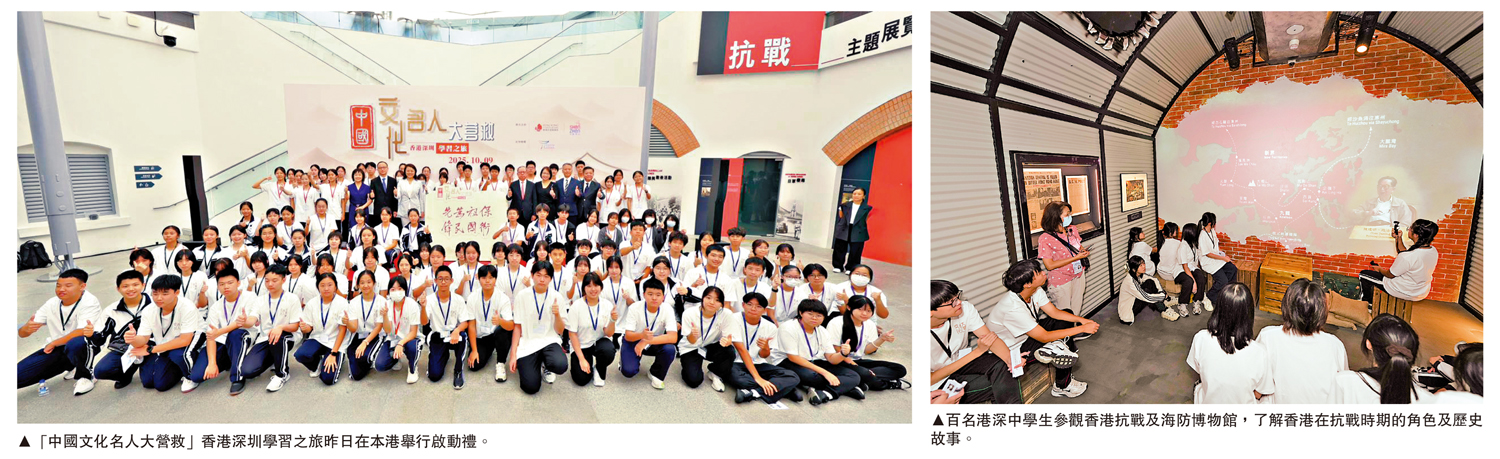 今年是中國人民抗日戰爭暨世界反法西斯戰爭勝利80周年,香港旅遊發展局與深圳市文化廣電旅遊體育局合作,推廣以「中國文化名人大營救」歷史為主題的研學旅遊路線。啟動禮昨日(9日)於香港海防及抗戰博物館舉行,隨後100名港深中學生展開一日行程,從史跡、展陳與交流中深化對抗戰歷史、家國情懷及國家發展的認識。