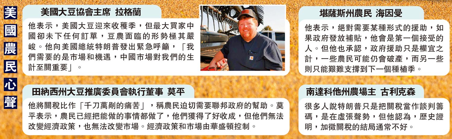 他表示,美國大豆迎來收穫季,但最大買家中國卻未下任何訂單,豆農面臨的形勢極其嚴峻。他向美國總統特朗普發出緊急呼籲,「我們需要的是市場和機遇,中國市場對我們的生計至關重要」。