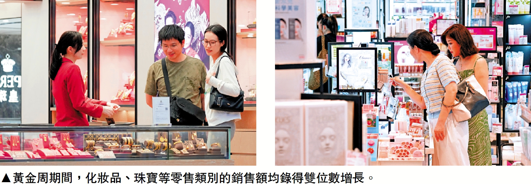 謝邱安儀表示,黃金周期間各零售類別表現各異,受惠於旅客及人流增長,化妝品、珠寶等銷售額錄得低雙位數增長,同時因金價比去年同期已累計上升數十個百分點,即使顧客傾向購買較輕的產品,但銷售額仍錄得低單位數增長,但傢具家品、時尚服飾等錄得單位數至低單位數不等的跌幅。