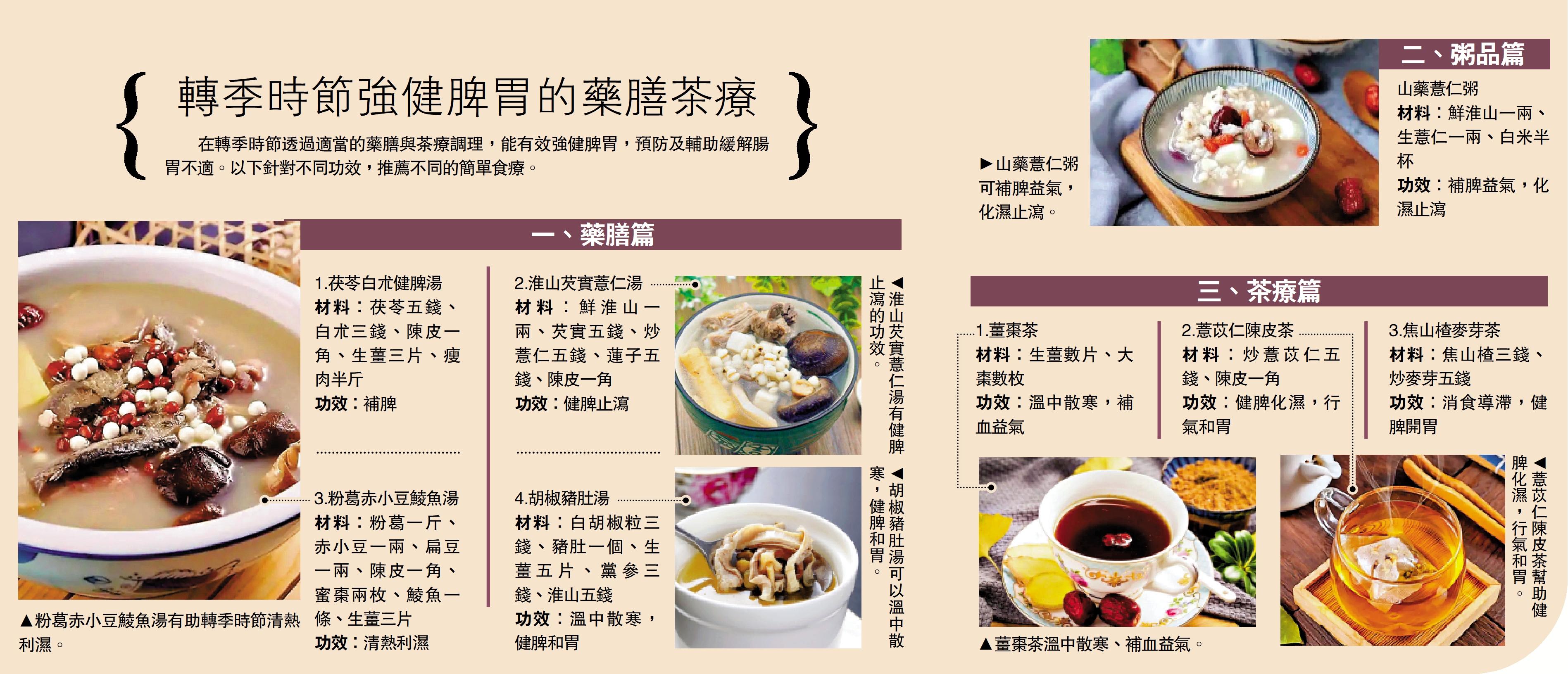 在轉季時節透過適當的藥膳與茶療調理,能有效強健脾胃,預防及輔助緩解腸胃不適。以下針對不同功效,推薦不同的簡單食療。